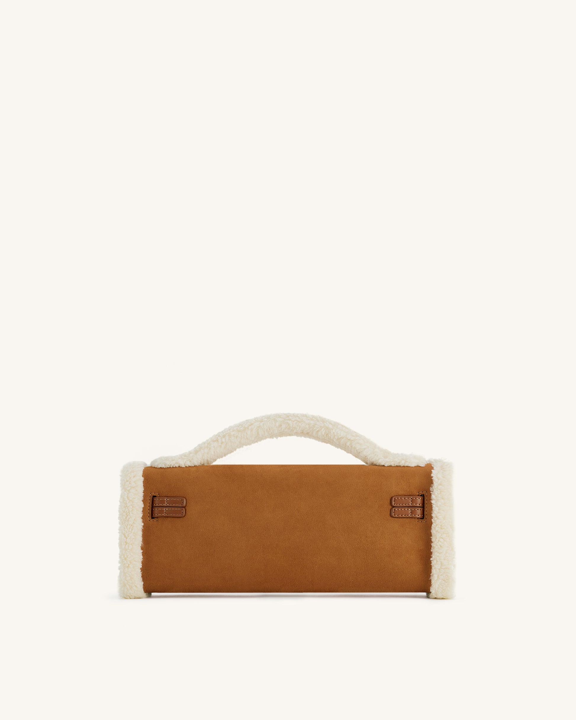 這款結構感矩形提把包以棕色仿麂皮製成,點綴溫暖毛絨滾邊。搭配金色金屬配件與安全旋轉鎖扣,造型小巧、溫暖又時髦。