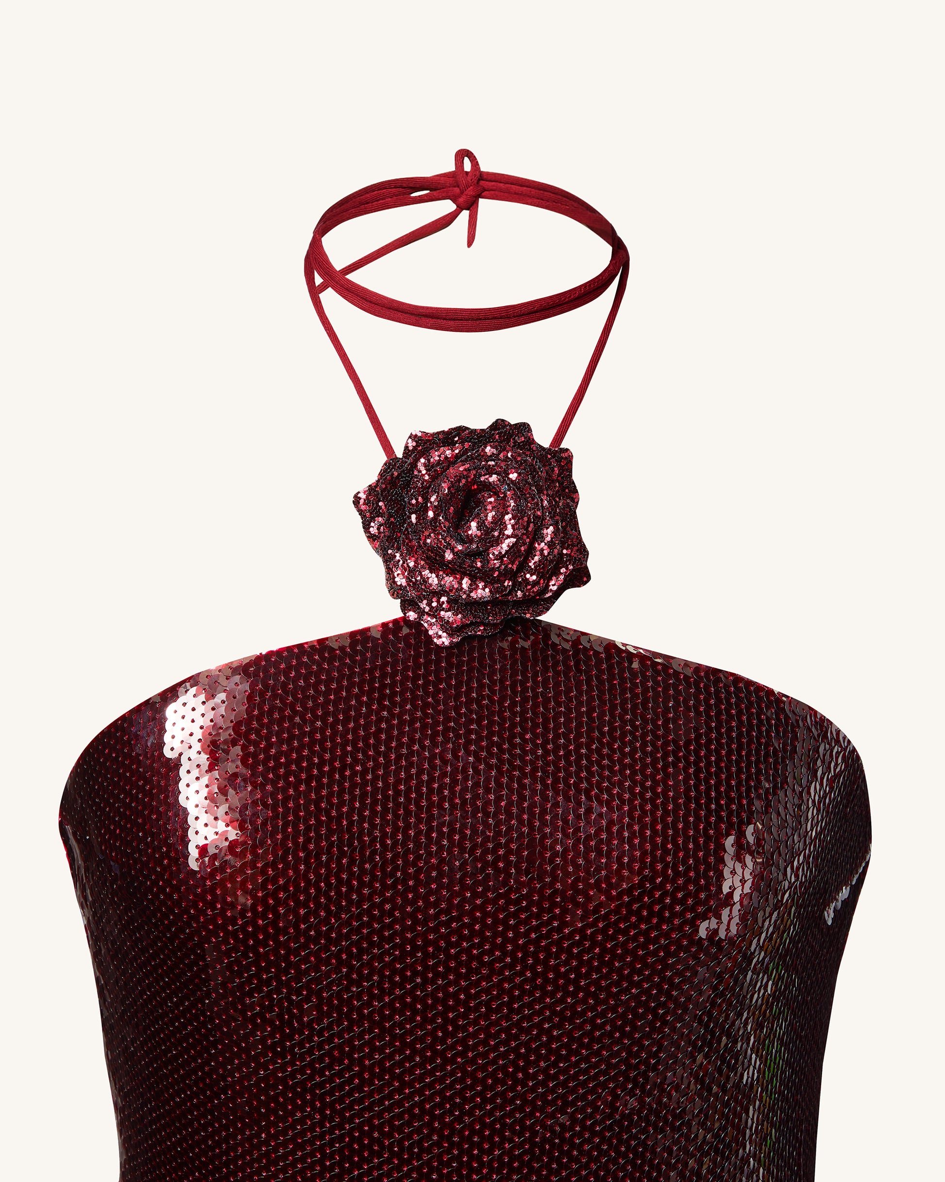 Burgundy 亮片掛脖迷你連衣裙 - 酒紅色