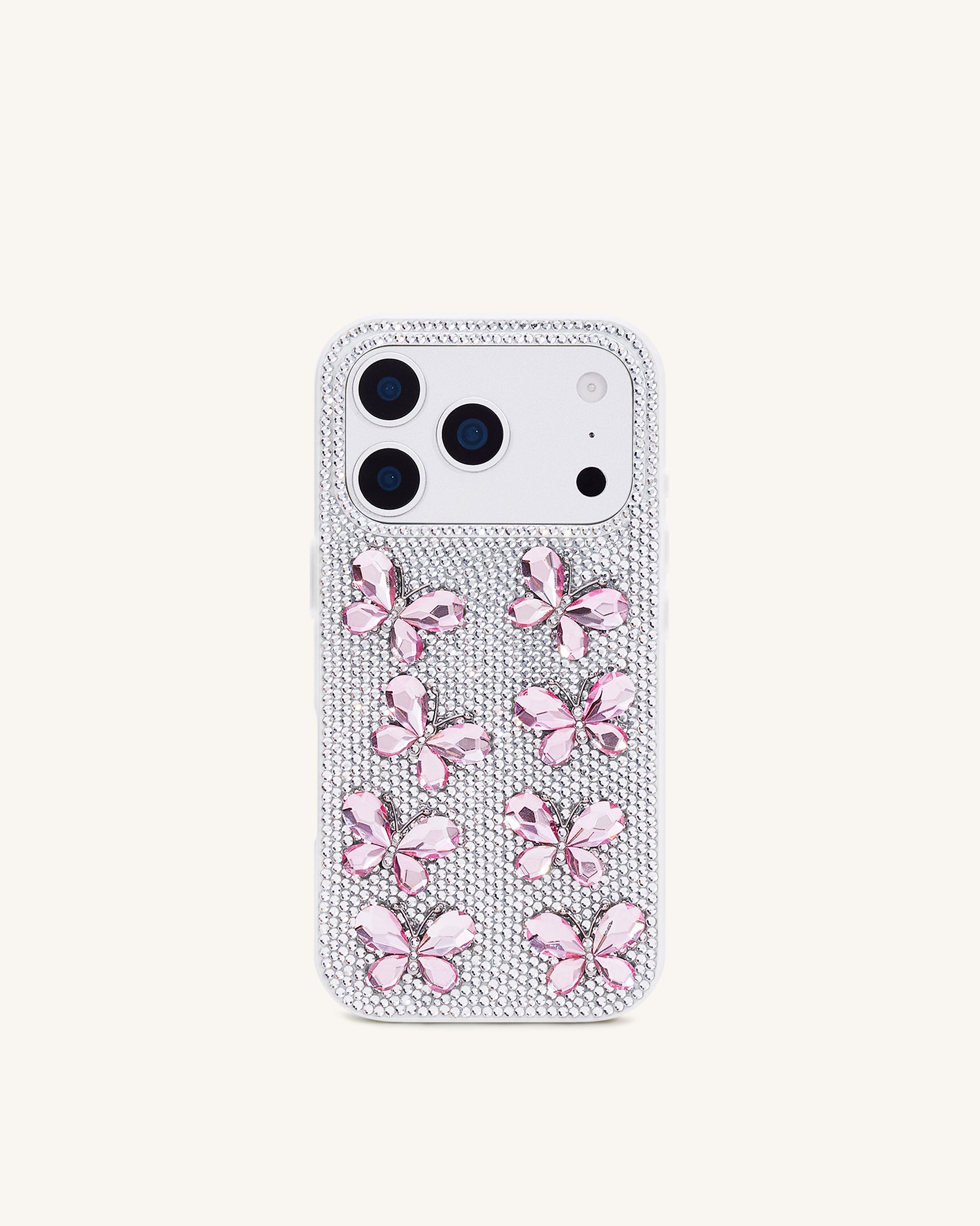 這款手機殼以白色水晶設計,點綴有3D粉紅色水晶蝴蝶。全包覆的裝飾帶來閃耀效果,提供基本保護、增強握感,同時作為時尚且裝飾性的配件。每個手機殼皆為手工製作,因此每件產品的工藝可能略有差異。