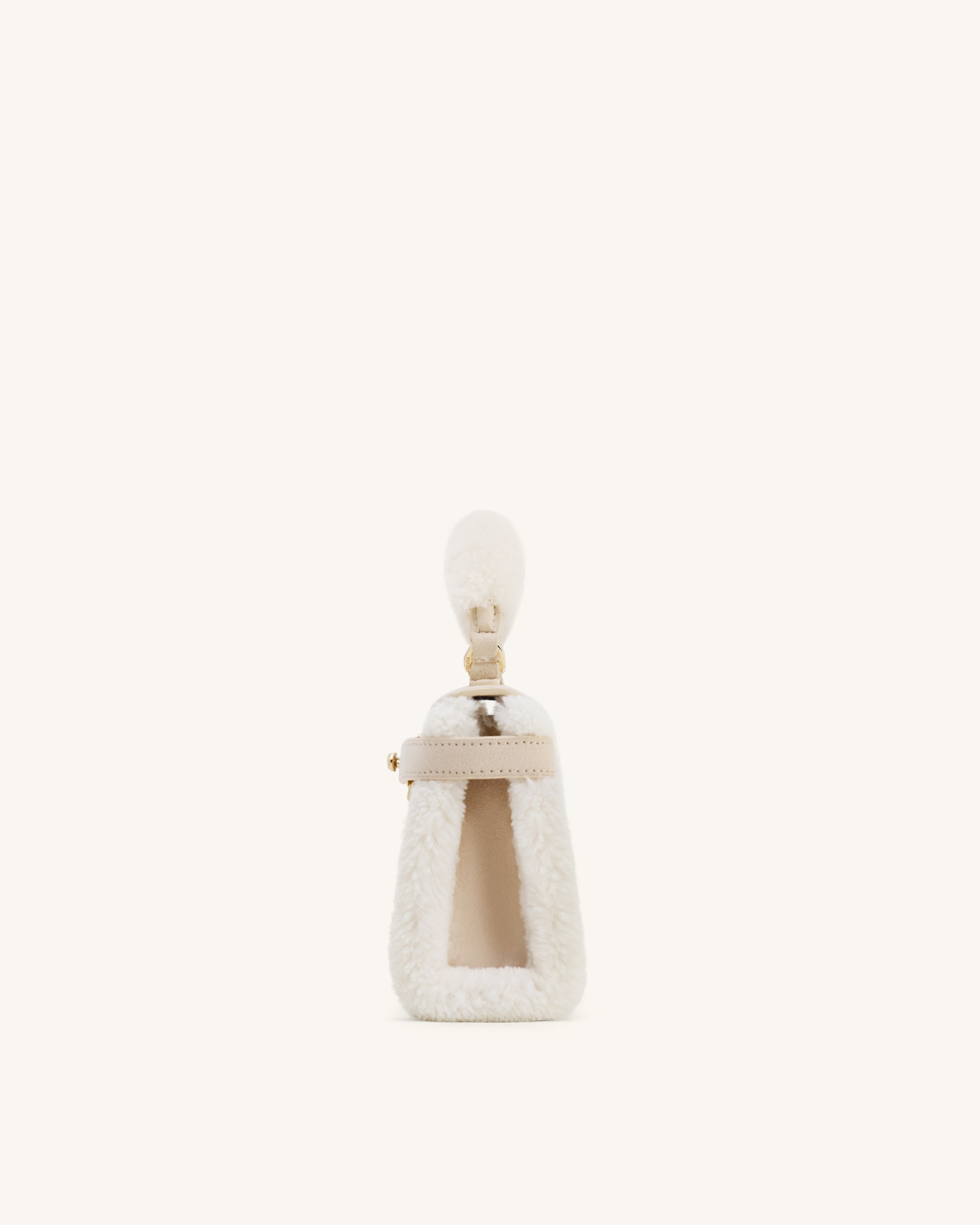 時尚有型的灰褐色仿麂皮迷你包。柔軟羊羔毛細節點綴手提把與側邊。金色五金增添迷人質感。手提或斜背皆適合。