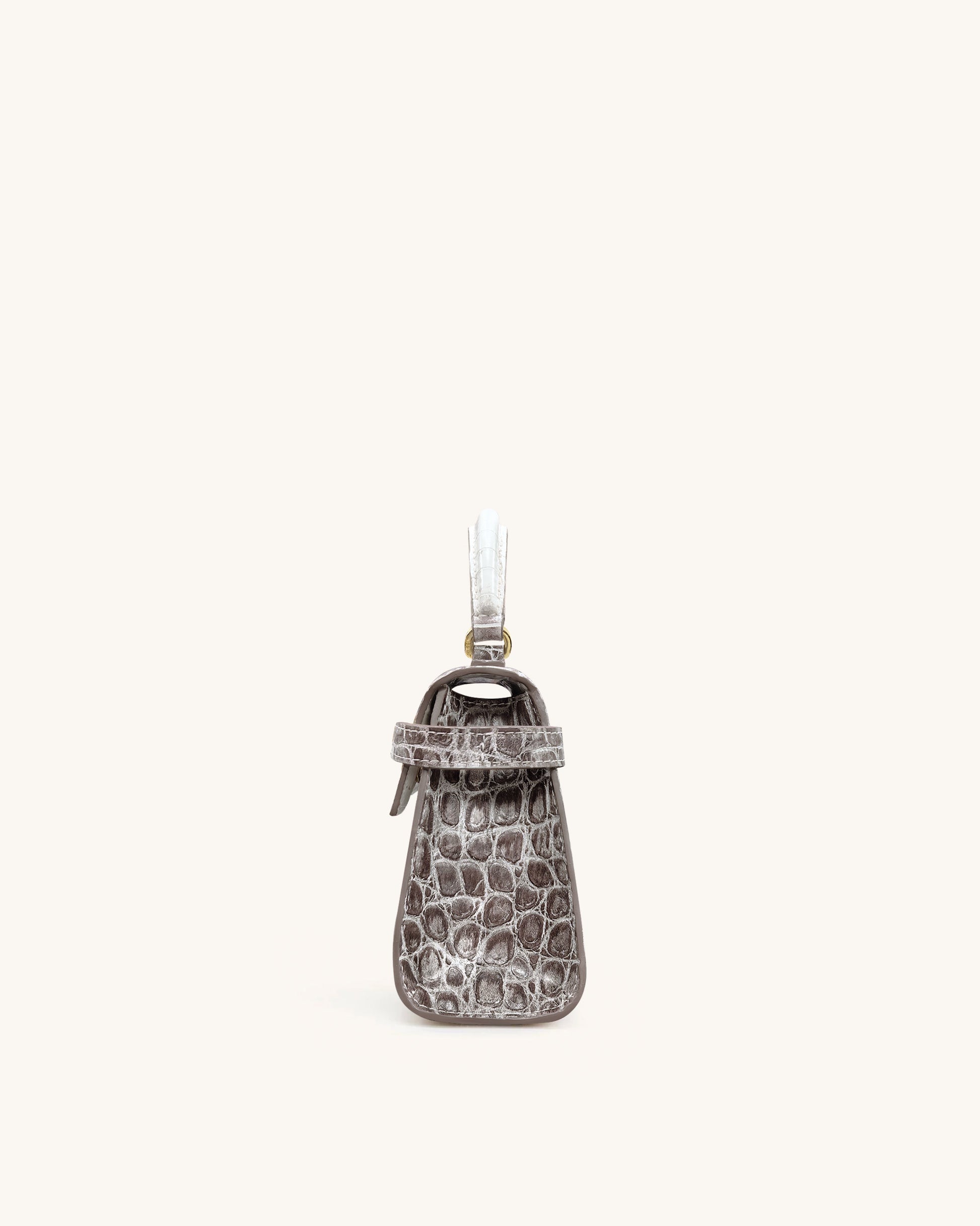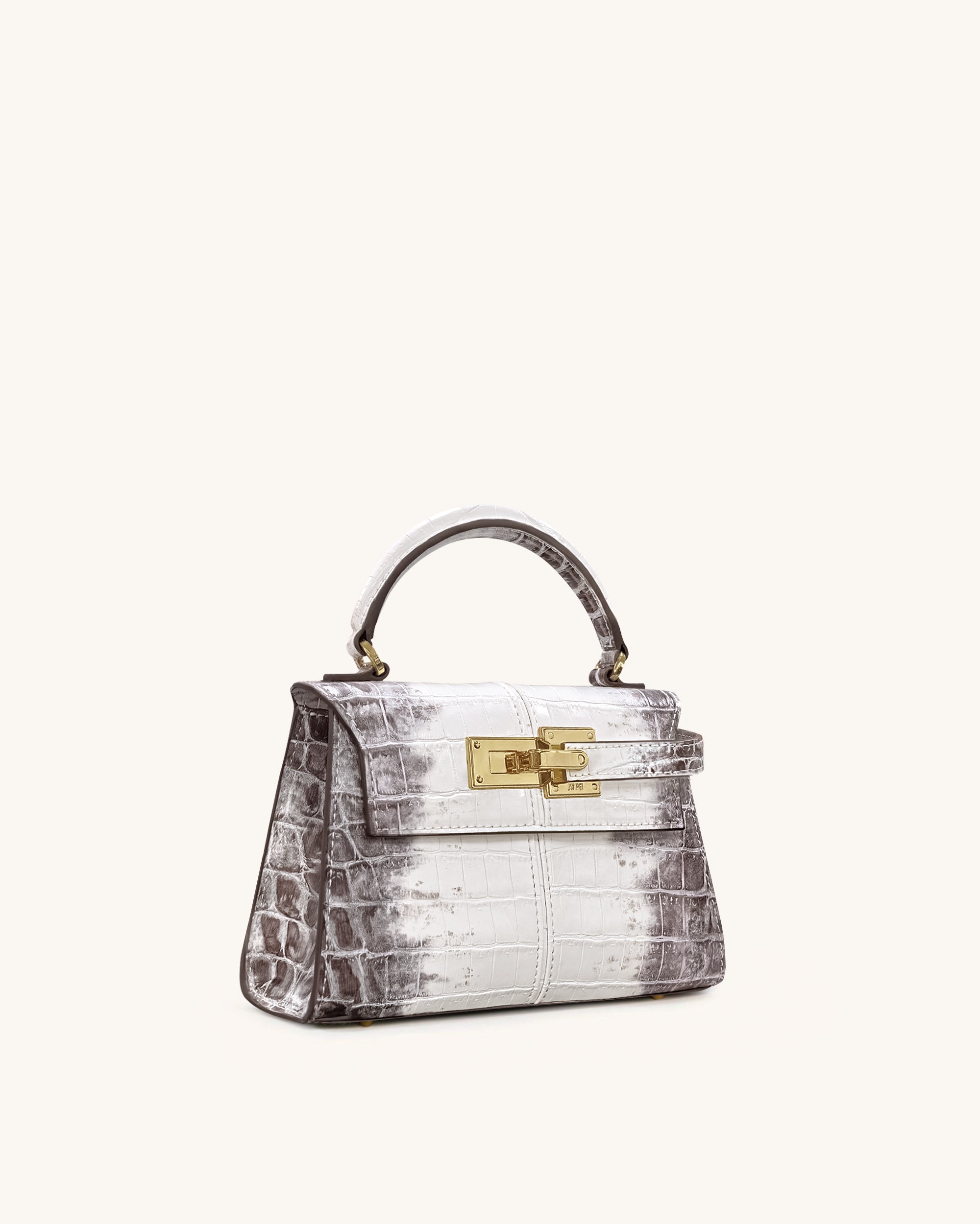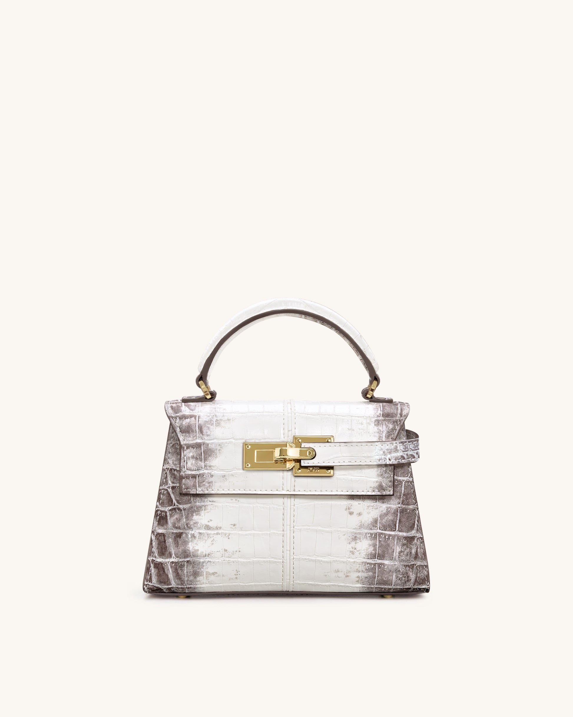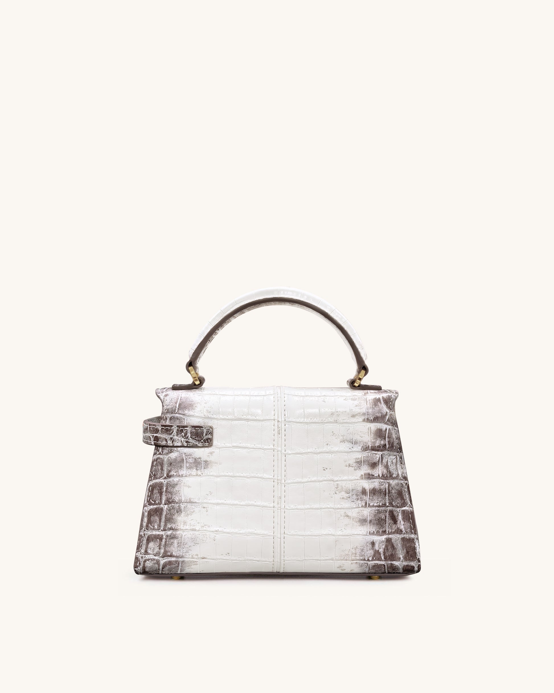 俐落鱷魚壓紋的素皮革,搭配精緻梯形輪廓。金色五金點綴現代感設計。附可調式可拆卸肩帶,攜帶方式多元。
