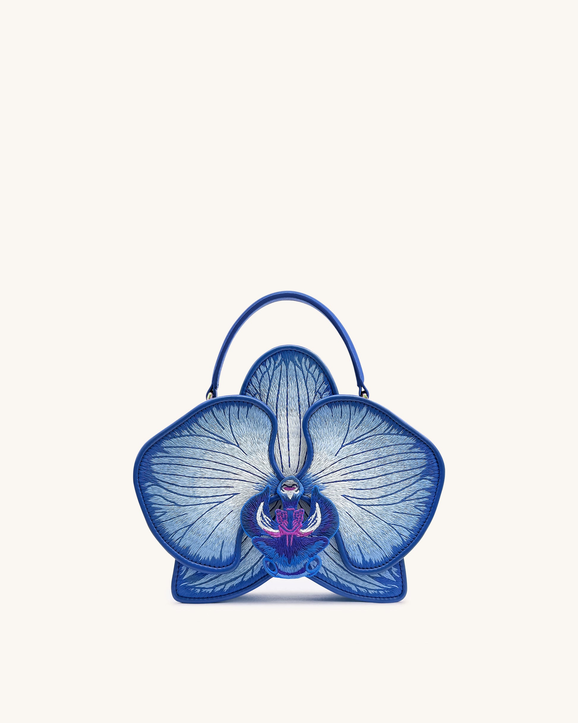 這款手提包以獨特的藍色蘭花剪影為設計,搭配細緻的刺繡,展現花瓣的紋理質感。結合堅固的手提設計,融合藝術氣息與功能優雅,成為任何場合的搶眼造型單品。