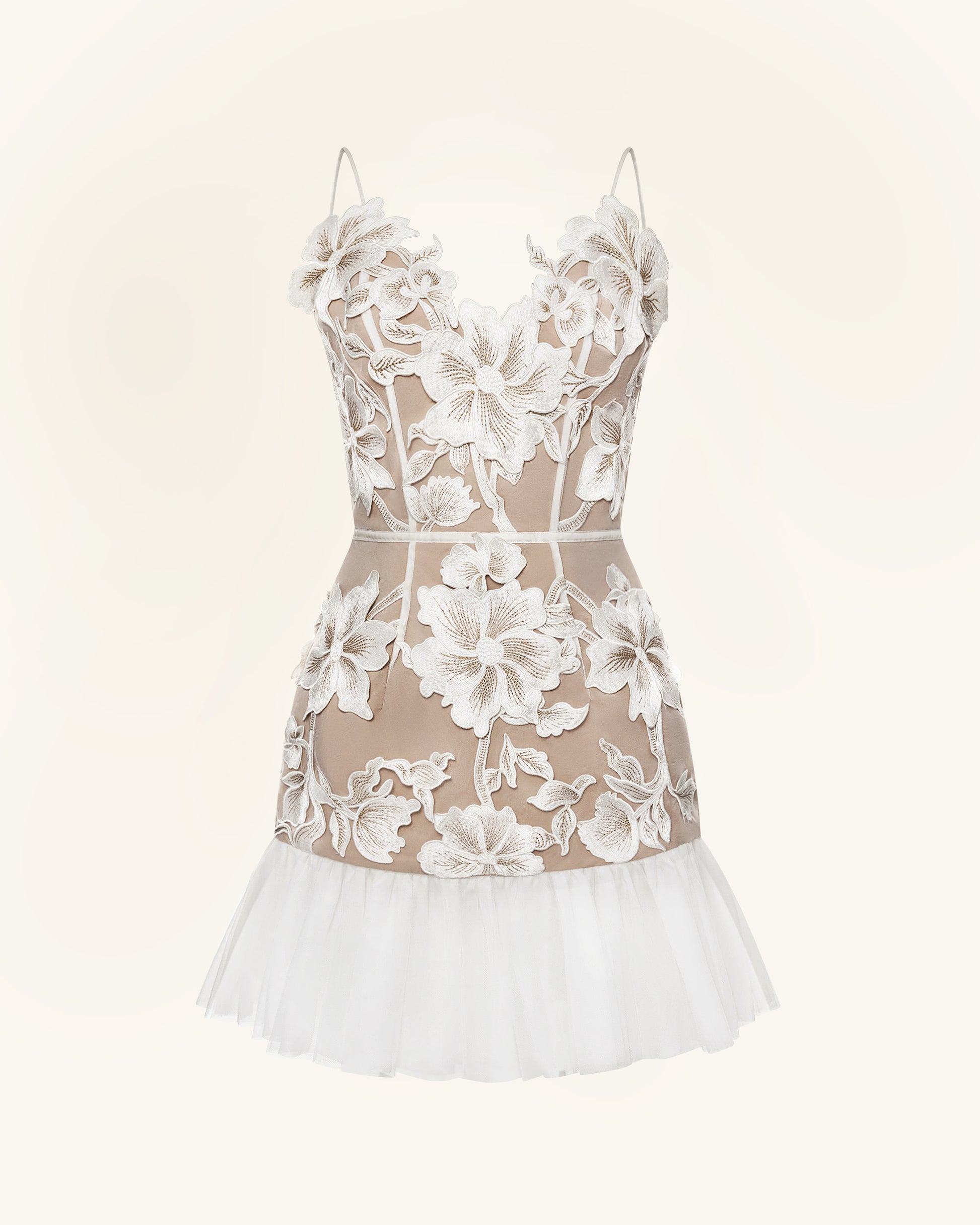 優雅與浪漫交織於這款透視網紗迷你洋裝,細緻的3D花卉刺繡點綴其間。裸膚色底襯搭配潔白花朵,合身的胸衣剪裁與擺襬荷葉邊設計,塑造迷人身形。非常適合約會之夜、婚禮場合或任何想要感受特別的時刻。