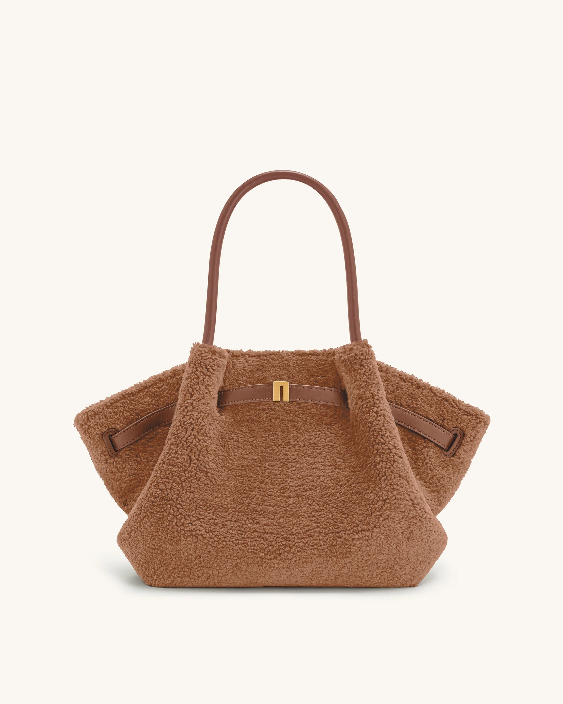 這款摩卡棕色的溫暖梯形托特包,擁有仿羔羊毛般柔軟絨毛質感與柔韌挺立的輪廓。配有加長提把及寬敞內部空間,結合了溫度與風格,是寒冷季節的完美配件。
