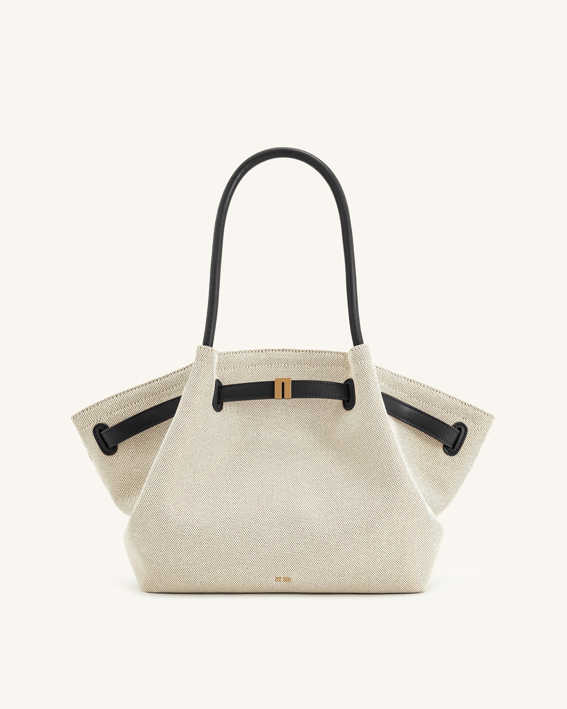 這款梯形托特包採用有質感的奶油色帆布包身,搭配俐落的黑色提把與滾邊細節。開口設計搭配金色點綴,營造極簡卻細緻的風格—適合上班、早午餐或日常外出。