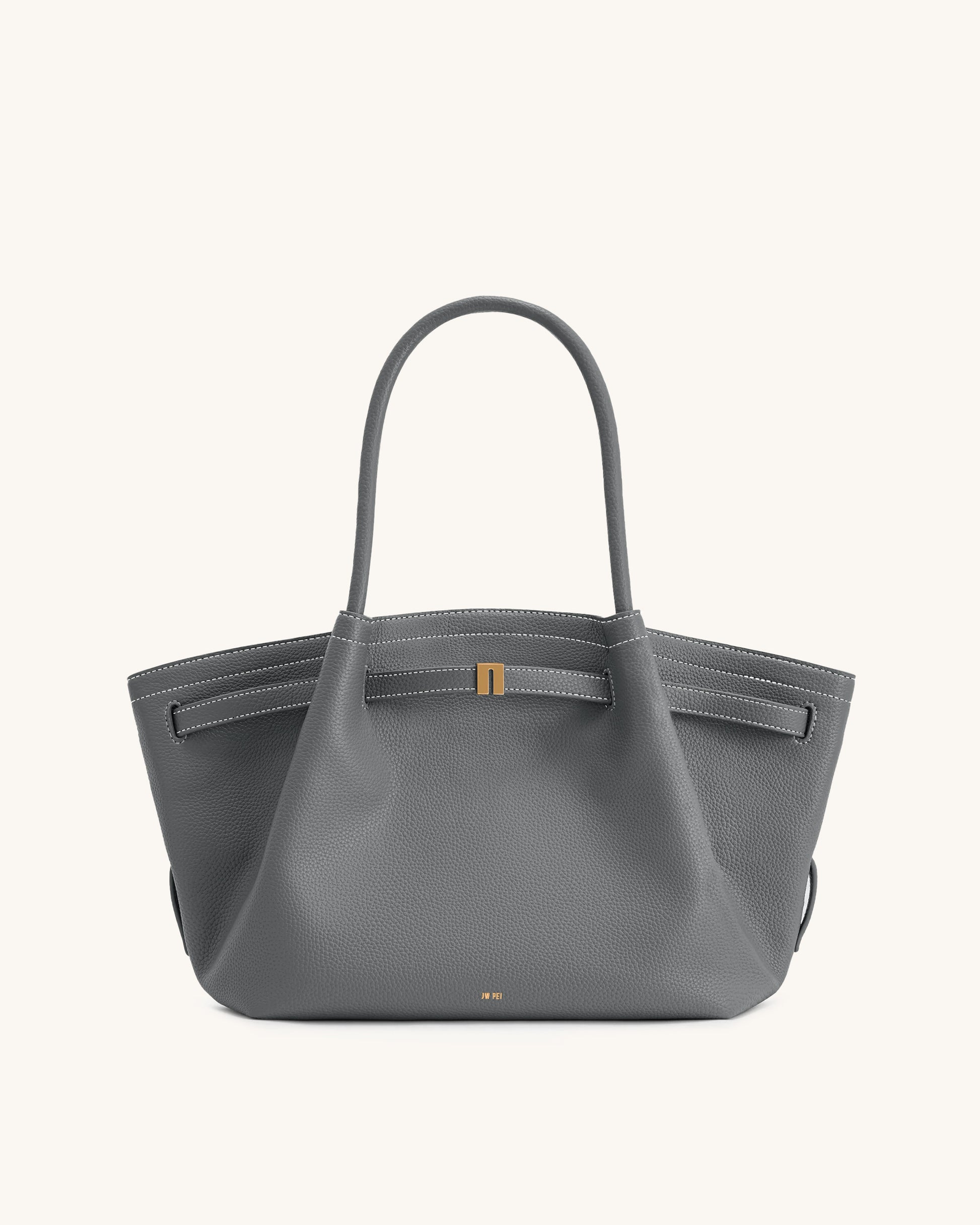 這款石板灰的挺版托特包採用雕塑感梯形輪廓與低調紋理,展現精緻且現代的風格。設計上配有長提把與磁扣開合,容量充足,可容納日常必需品,為穿搭增添內斂優雅的氣質。