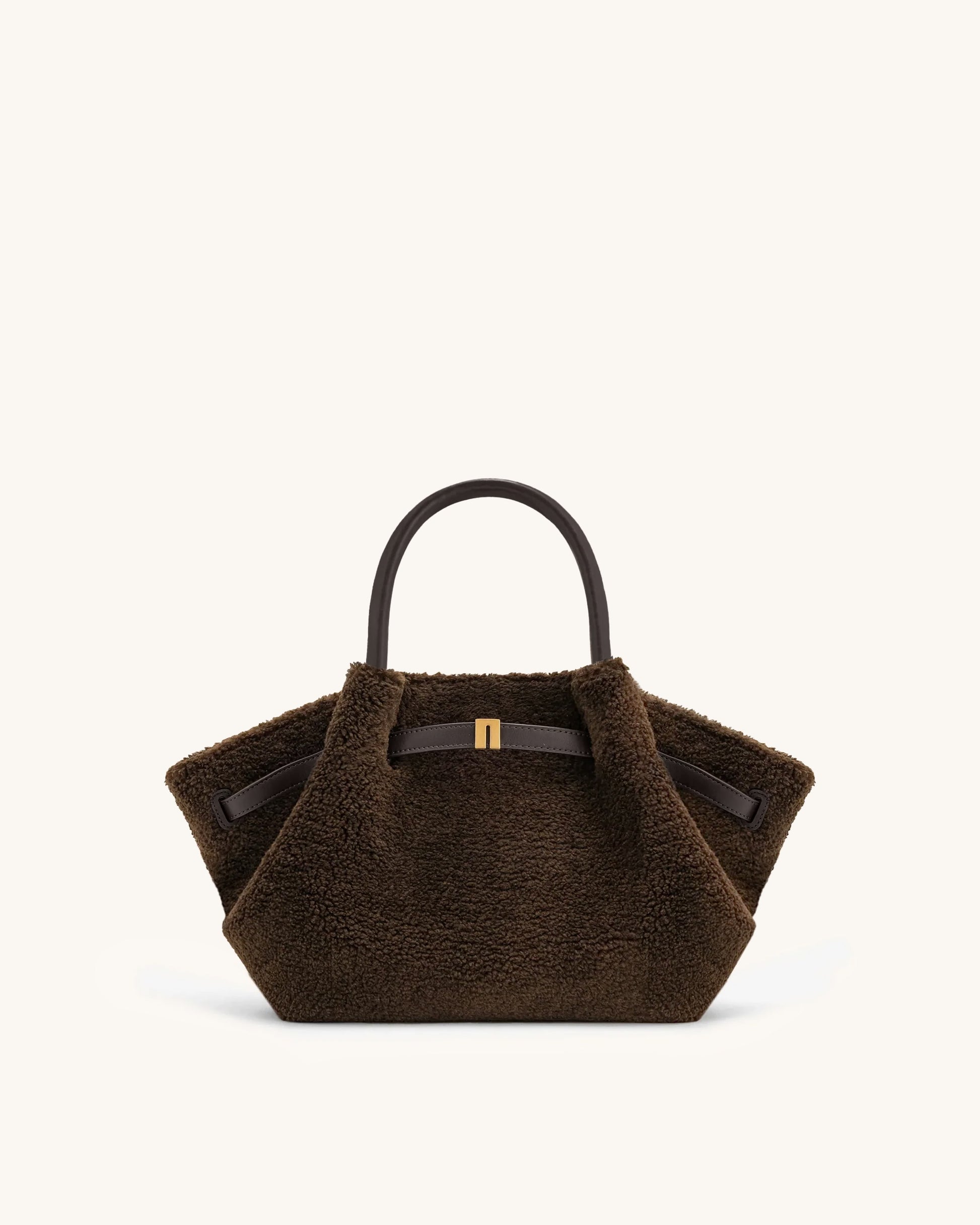 這款舒適的托特包採用雕塑感的梯形輪廓,表面為柔軟的深棕色羊羔毛質感。搭配光滑的皮革感提把及金色細節,是寒冷天氣中為日常穿搭增添溫暖與時尚的理想夥伴。