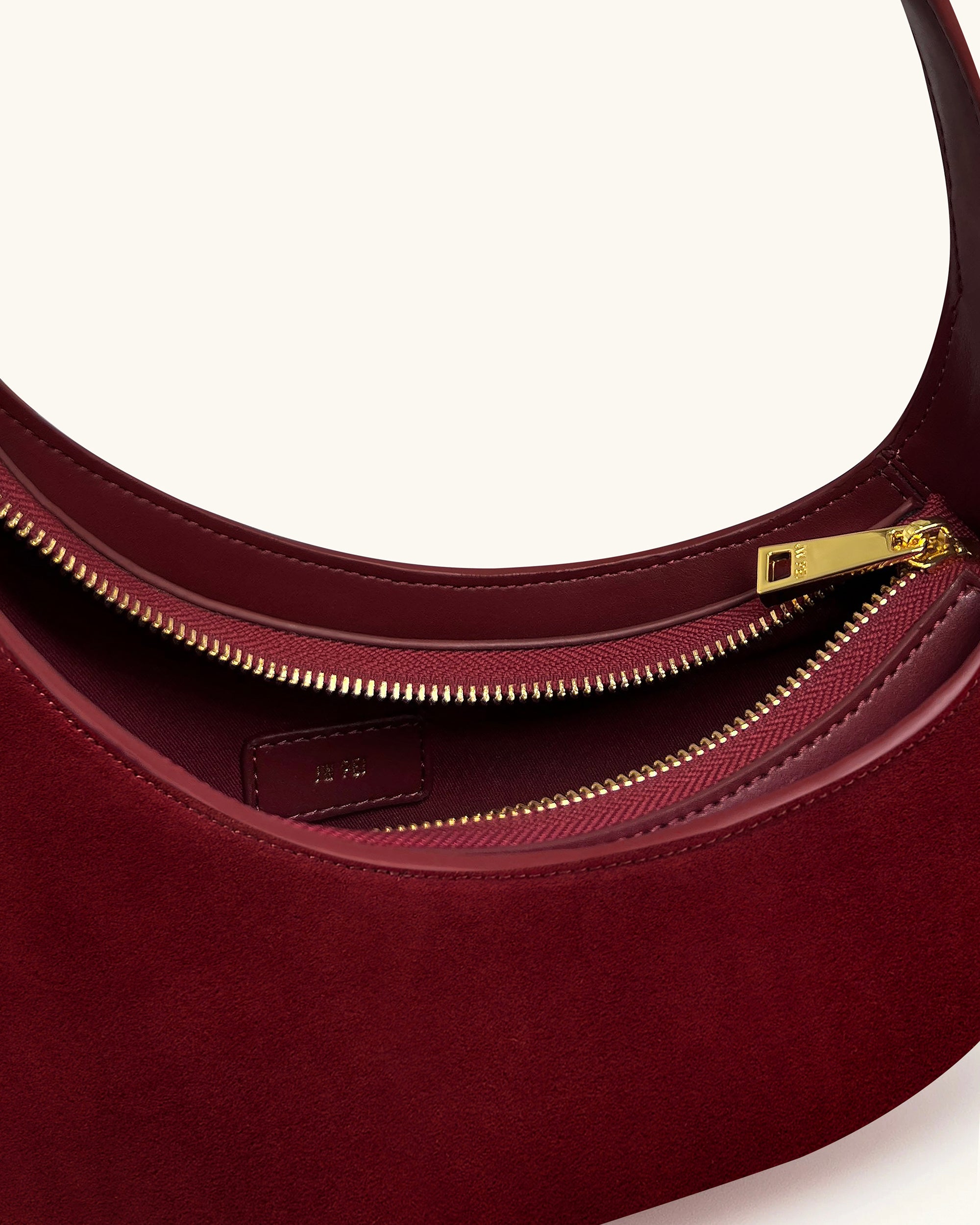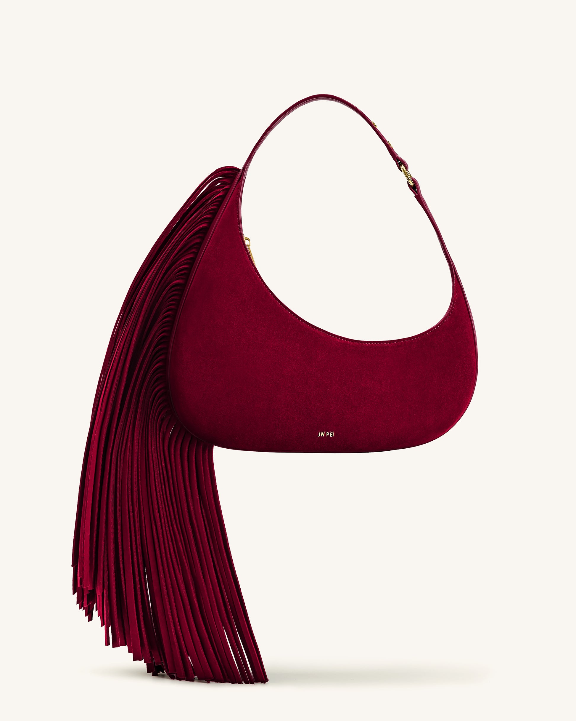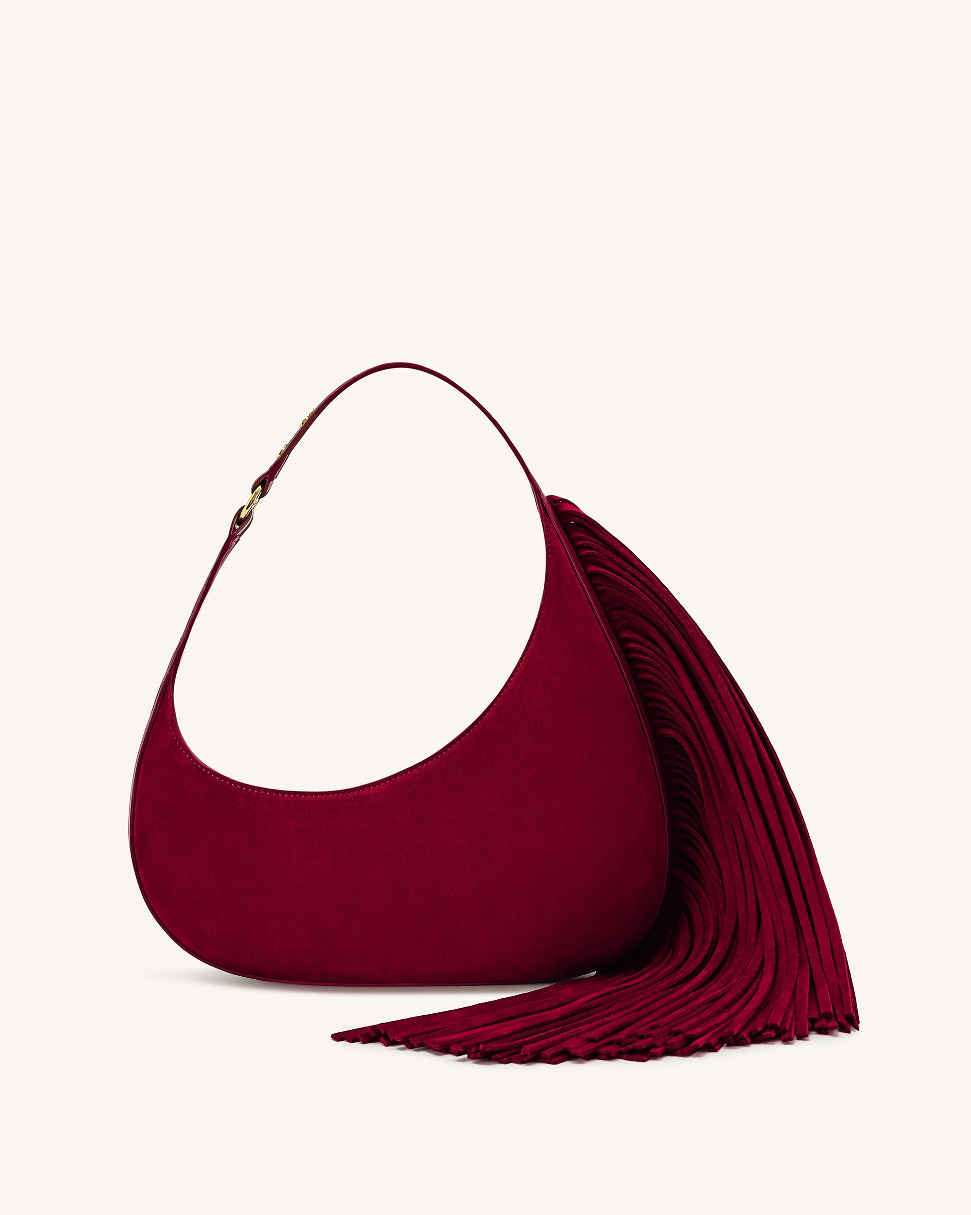 這款酒紅色肩背包採用仿麂皮製成,擁有俐落的月牙形輪廓,搭配長流蘇設計,展現大膽且時尚的風格。輕盈卻結構挺立,完美融合波西米亞風情與都會感,是日夜造型皆宜的理想之選。
