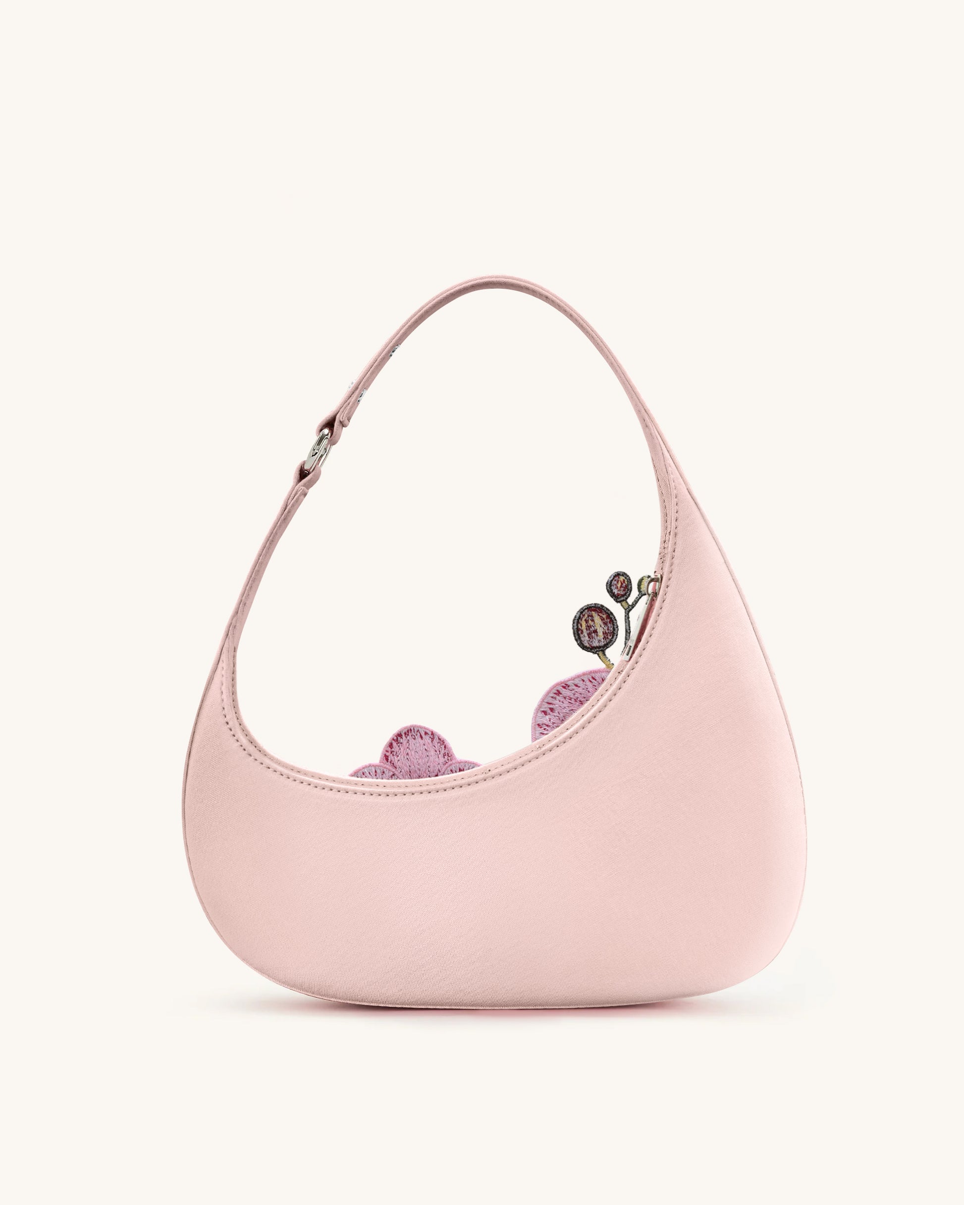 這款粉色肩背包擁有優雅的弧形輪廓,搭配醒目的蘭花刺繡,展現大膽的花卉風格。採用具有紋理感的布料製成,結構挺立,為日常造型增添一抹藝術氣息。