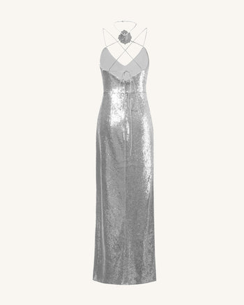 Heisey 銀色亮片玫瑰花超長連身裙-銀色