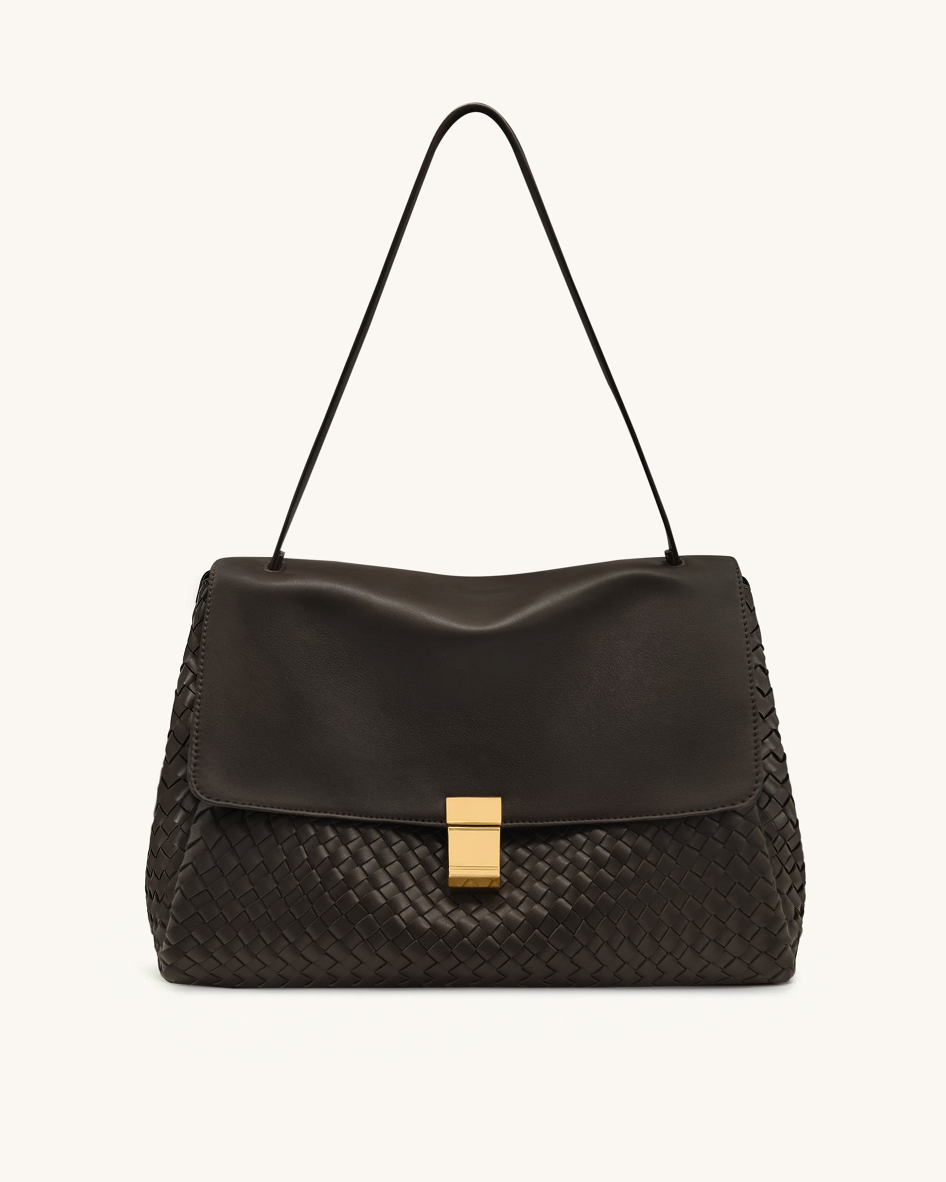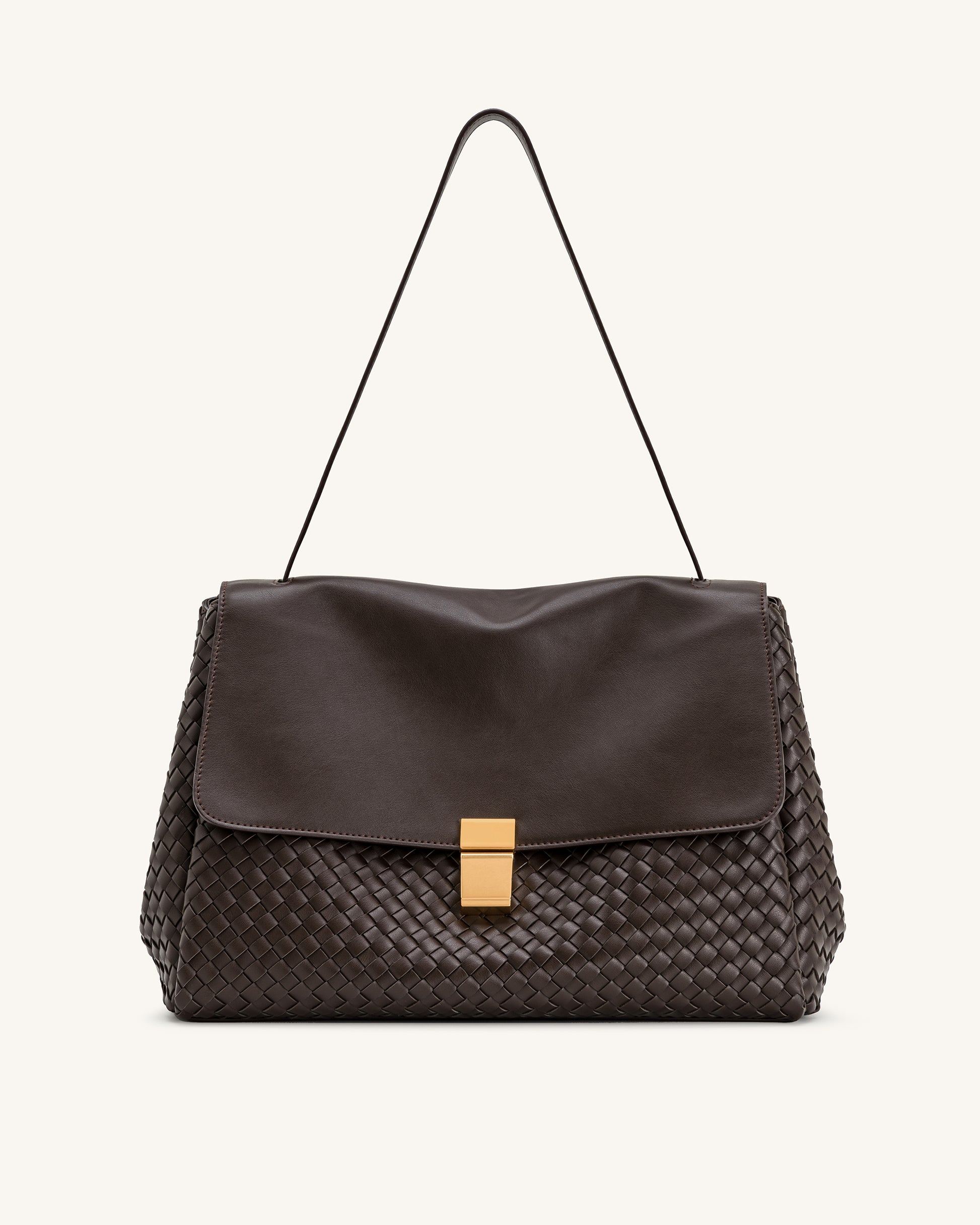 這款優雅的肩背包採用柔滑的仿皮翻蓋與深濃咖啡色編織底部設計。搭配金色扣環與簡約肩帶,展現永恆優雅與日常實用性。
