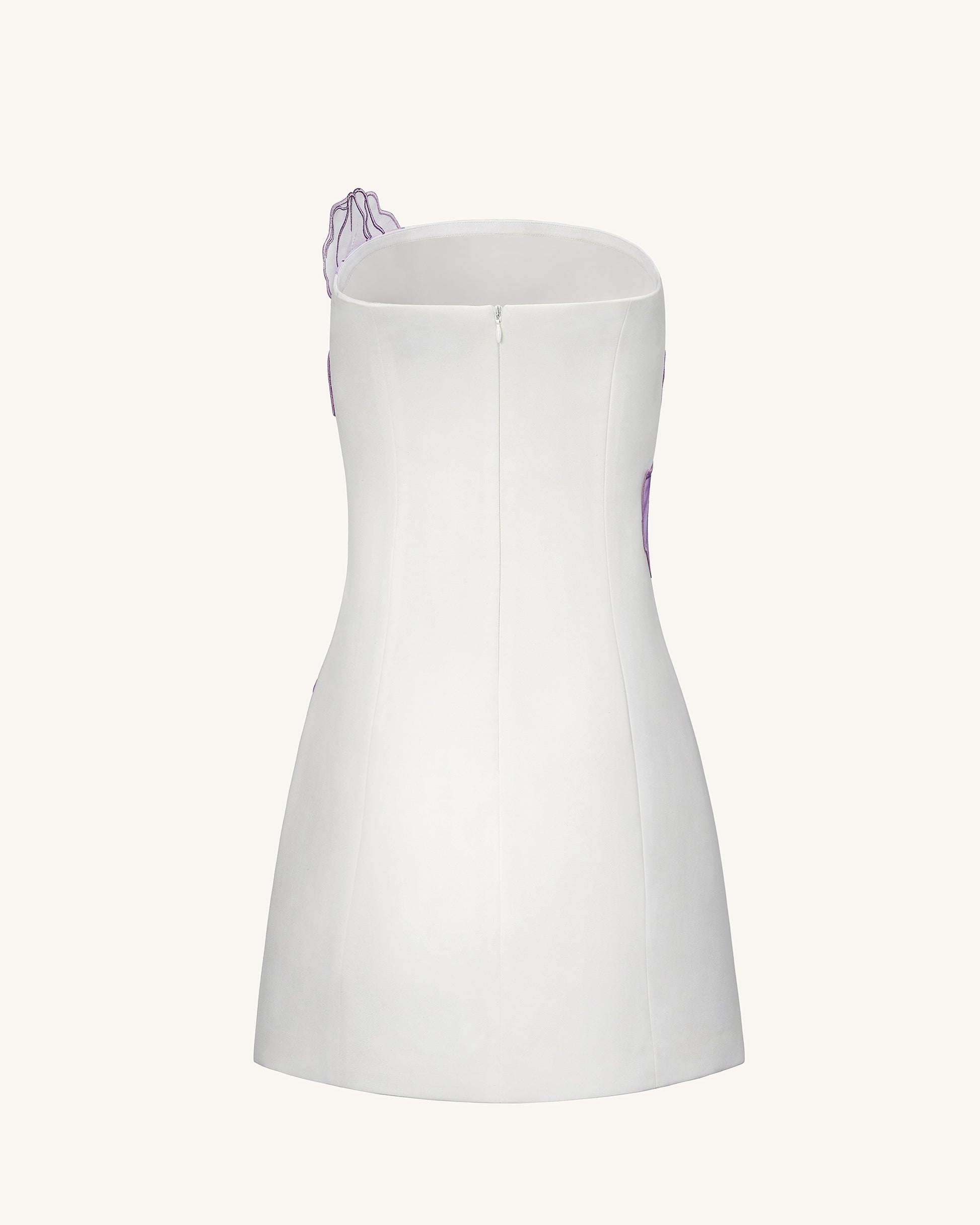 這款平口迷你洋裝擁有合身的剪裁與光滑挺括的布料。前身以柔和的紫色與綠色鳶尾花圖案大膽點綴,視覺效果強烈。乾淨的裙擺長度落在膝上。整體造型簡約,花卉圖案鮮明搶眼。