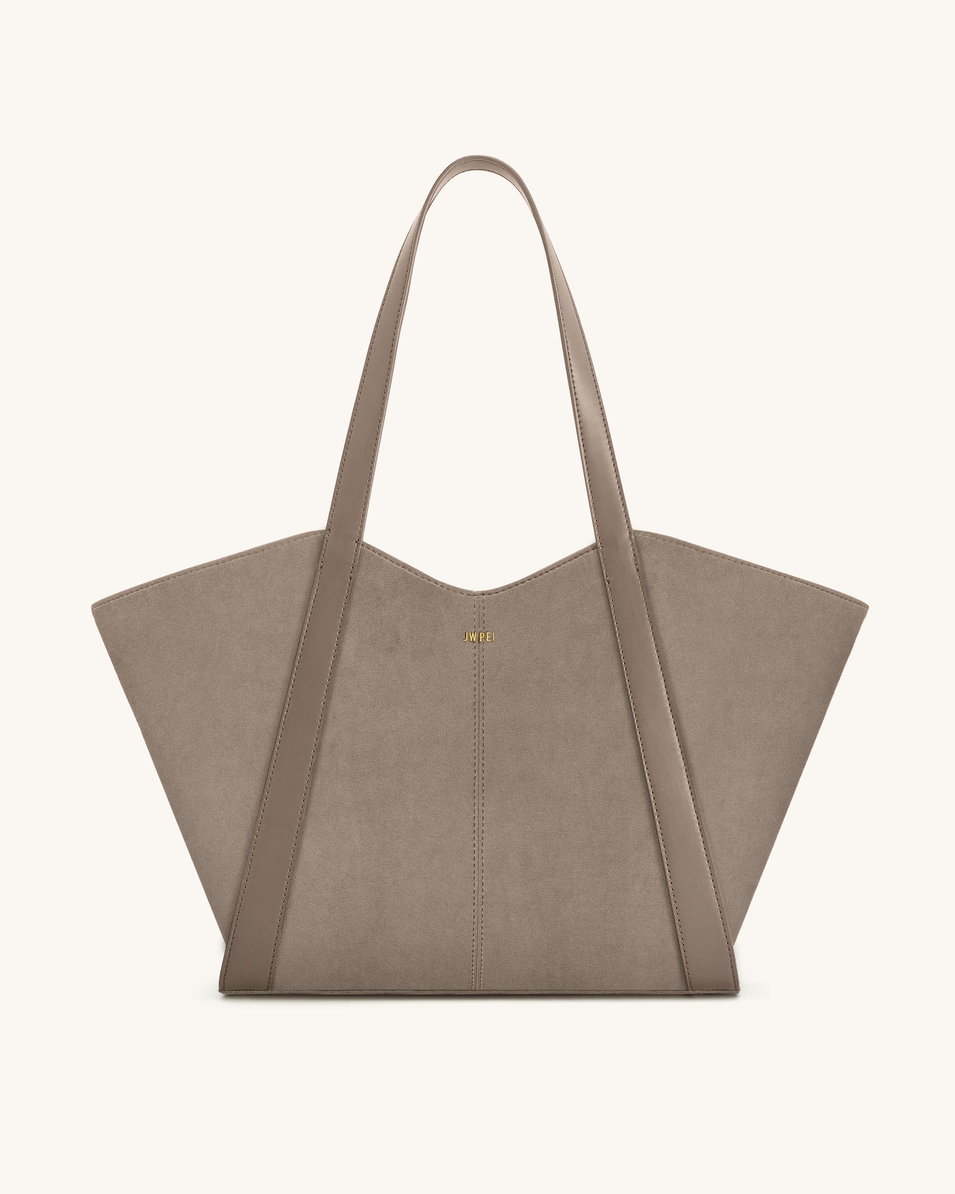 這款超大容量托特包採用細緻的灰褐色調,擁有簡潔的梯形輪廓與柔霧面質感。配有寬肩帶及寬敞內部空間,輕鬆搭配你的工作日與週末造型。