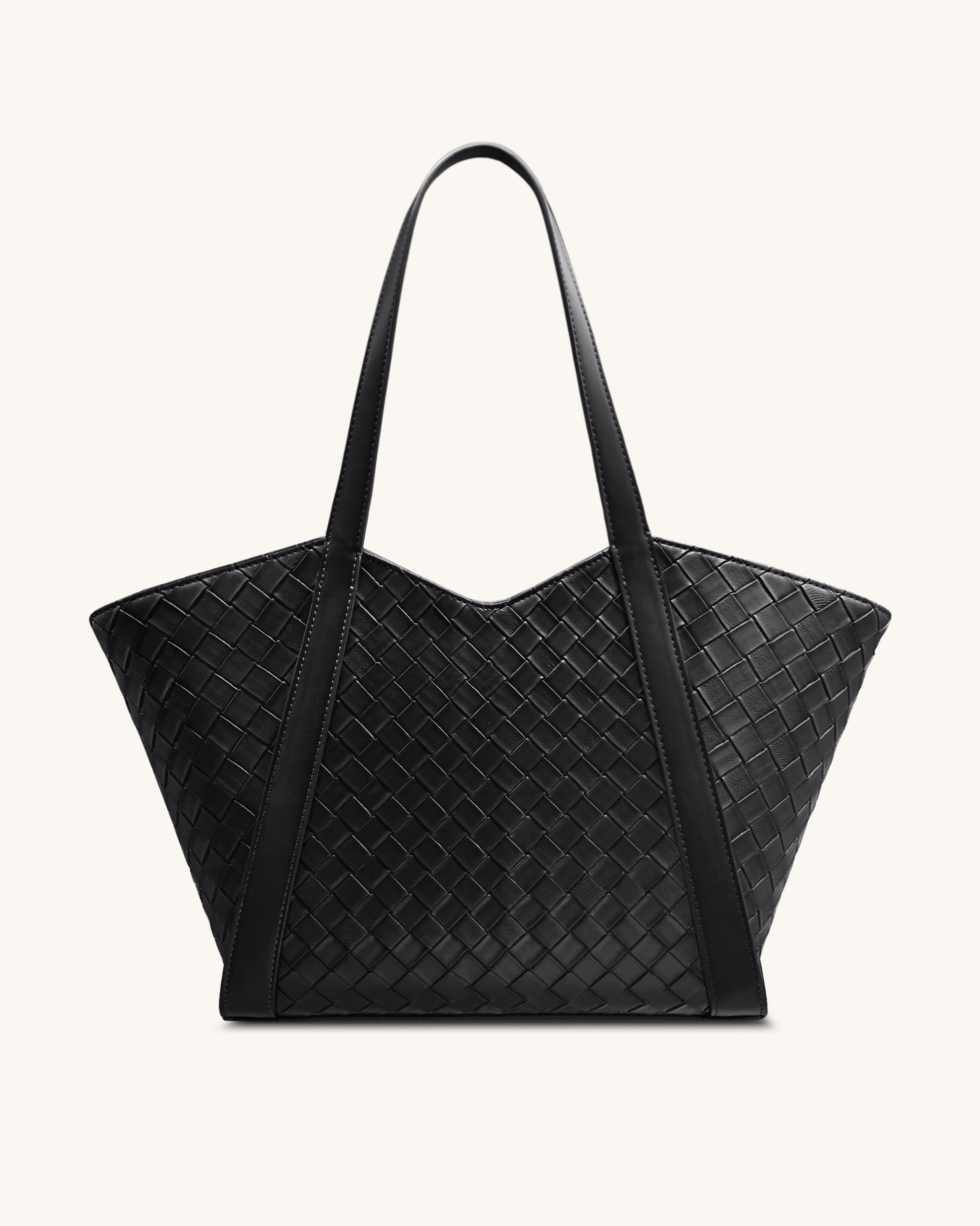 這款超大容量黑色托特包擁有流暢的梯形輪廓及仿編織紋理,增添視覺層次感。寬肩帶和寬敞內部空間,是通勤、購物或旅行的理想之選,兼具實用與現代風格。