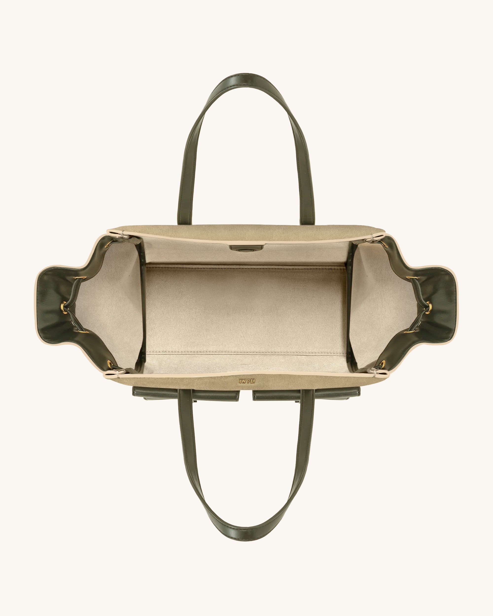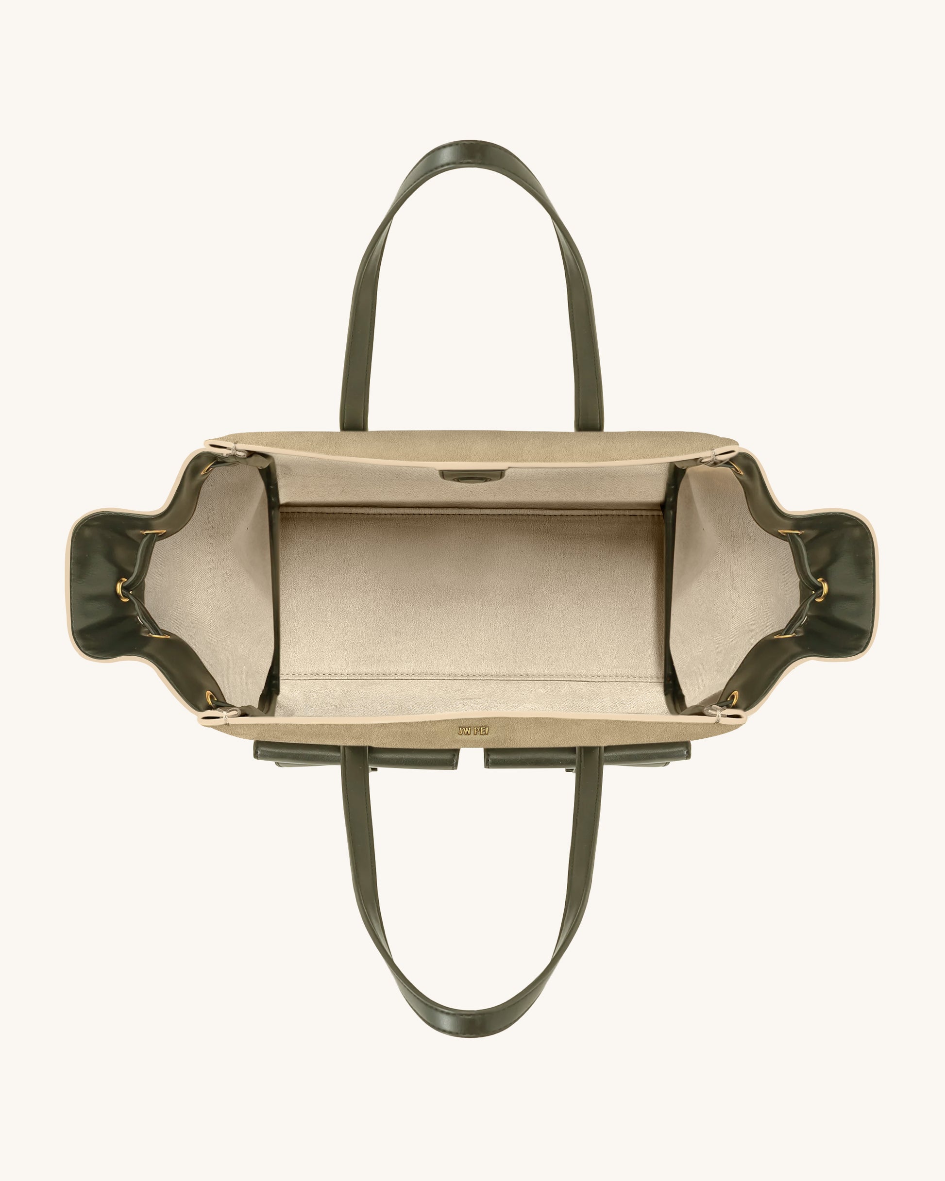 大容量、多功能又時尚。正面設有雙口袋,搭配金色五金與柔軟仿麂皮質感。可收納日常必需品及 iPad Mini。