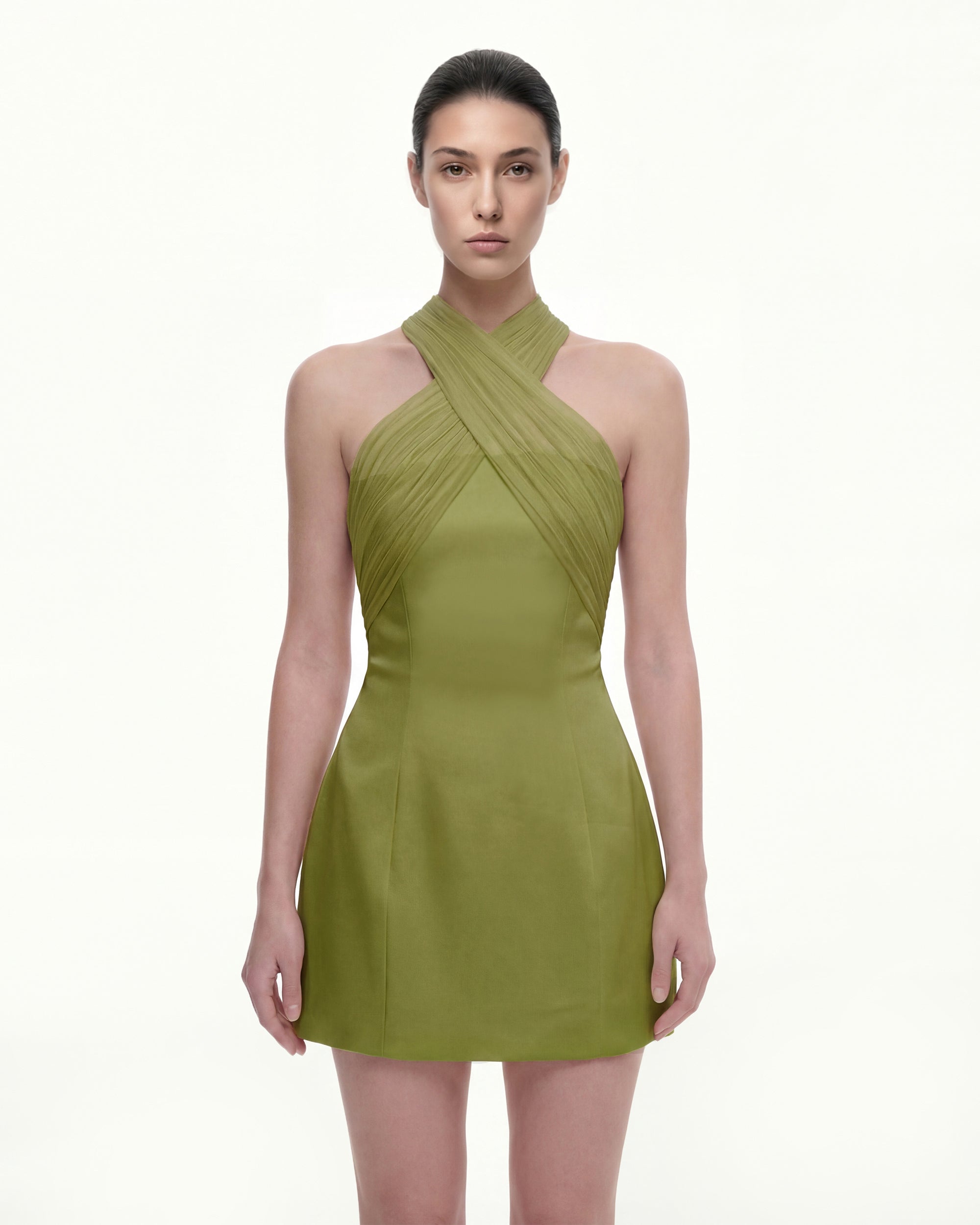 緞面薄紗交叉掛脖迷你裙 - 橄欖綠
