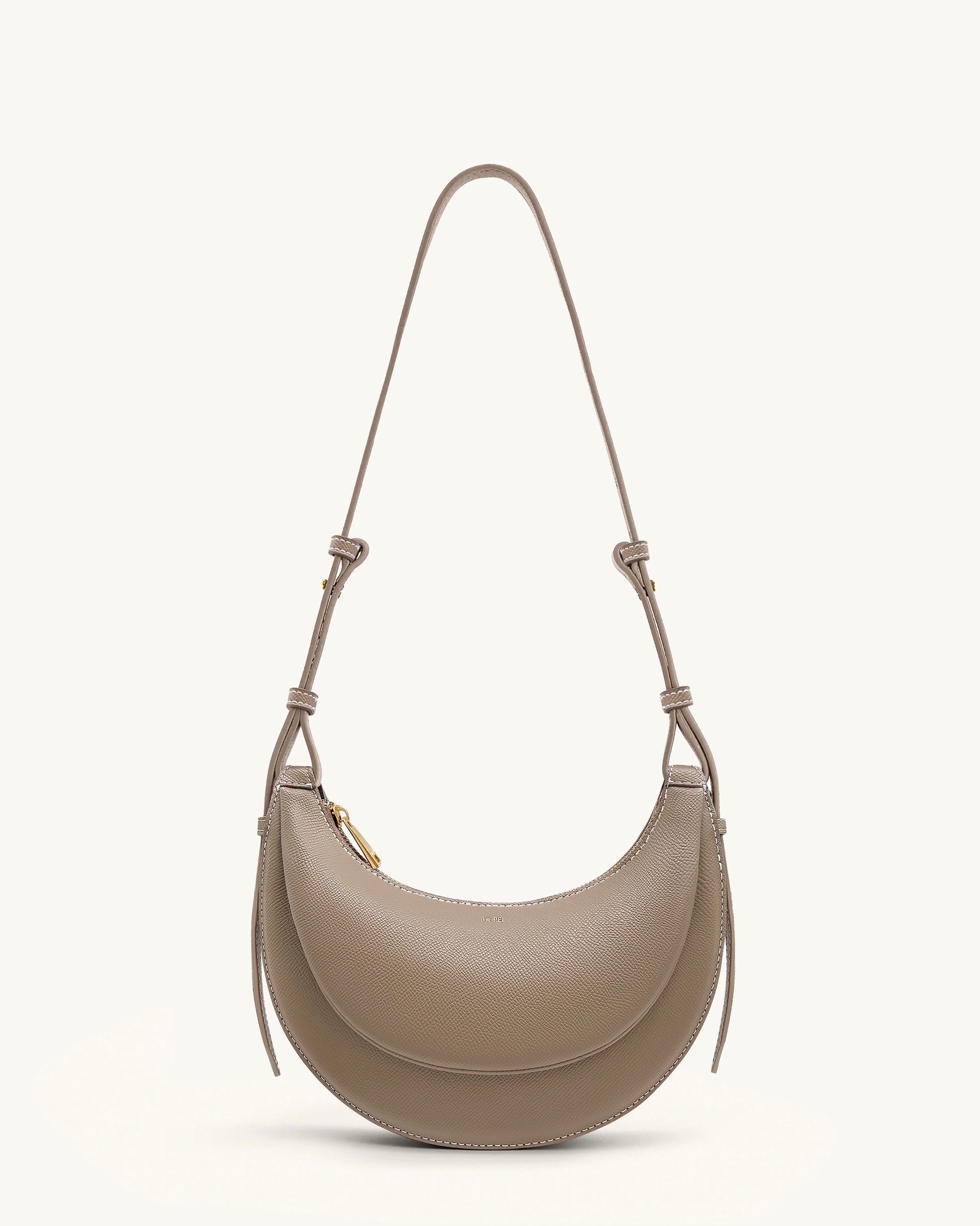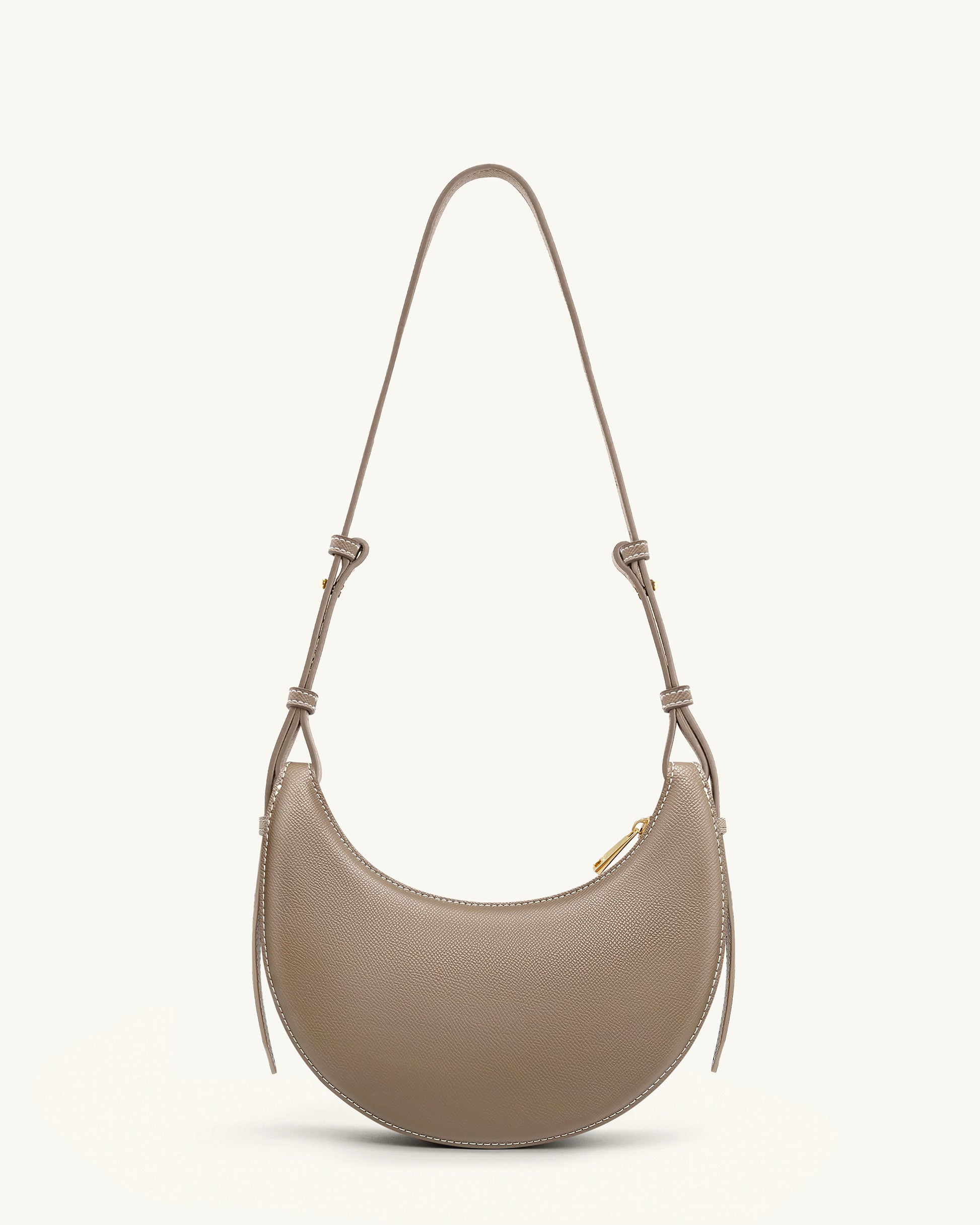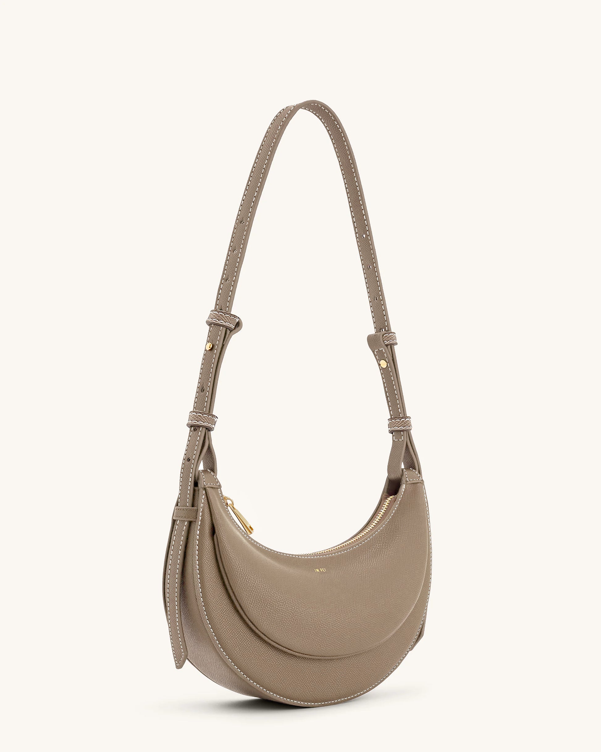 這款半月包採用帶有棕櫚紋理的素皮革製成。配有金色拉鍊和可調式肩帶。內部一個插袋可收納必需品。適合放入 iPhone 16 Pro Max。