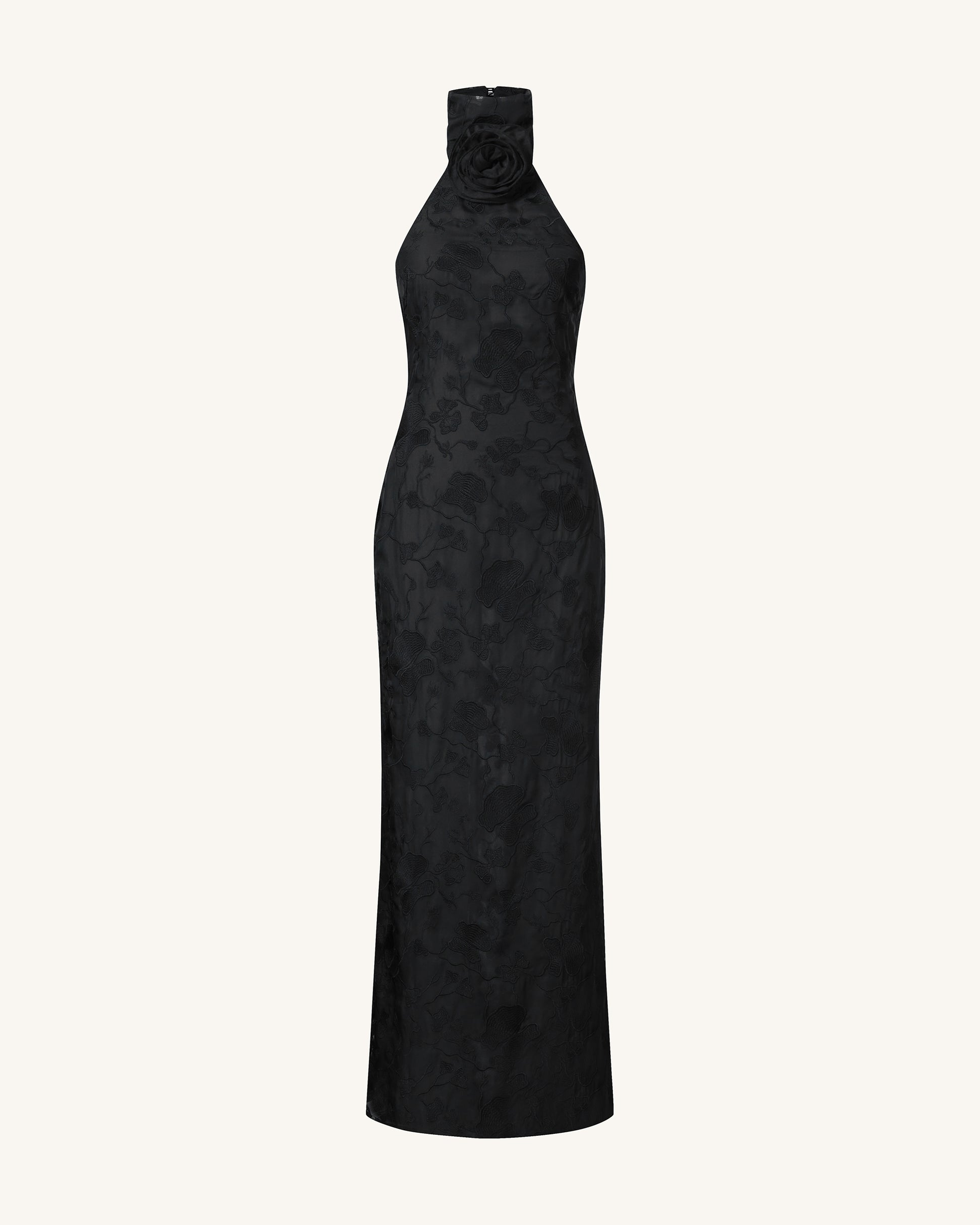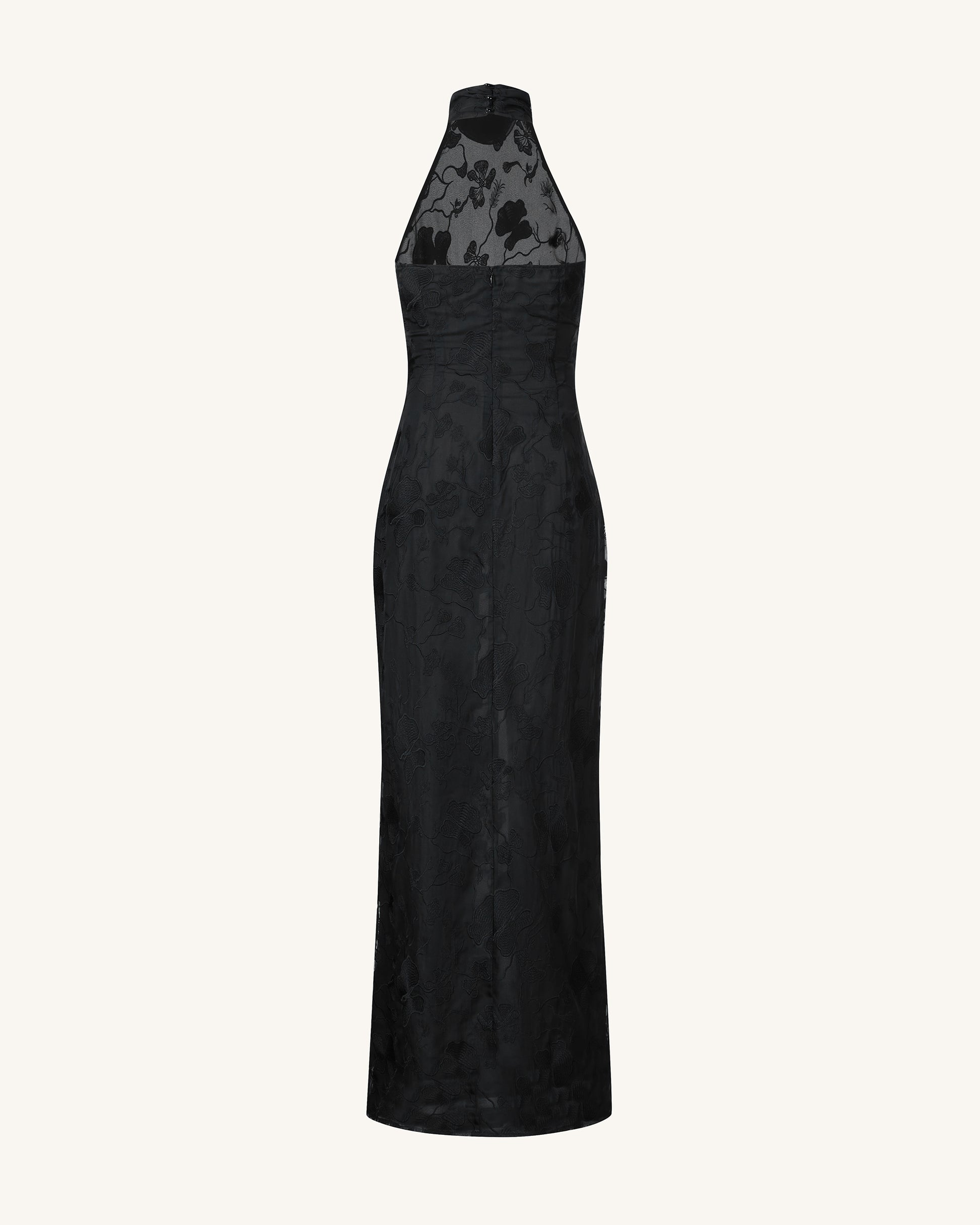 Uliana 黑色花卉蕾絲掛脖長連衣裙 - 黑色