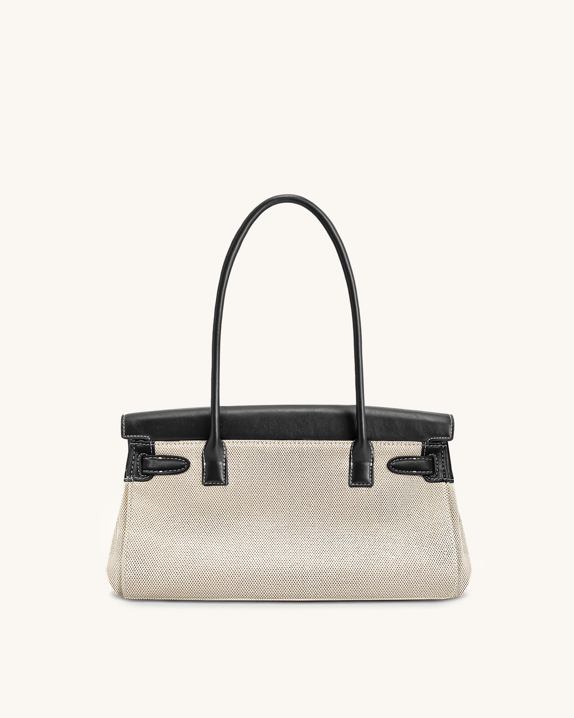 時尚有型的帆布與純素皮革拼接手提包。黑與米色的撞色設計搭配金色五金,展現經典品味。容量充足,可收納日常用品,搭配扭轉鎖扣設計,使用更安心。
