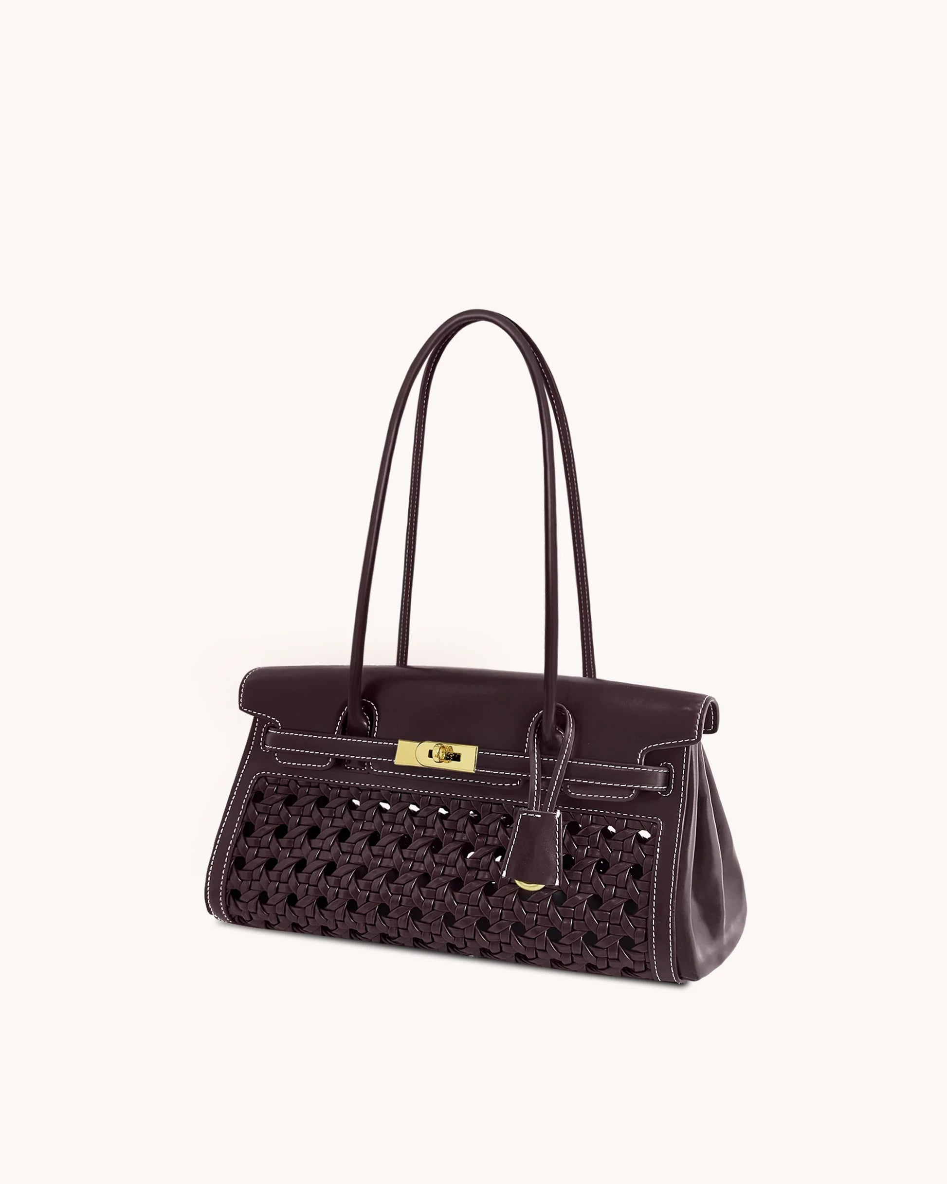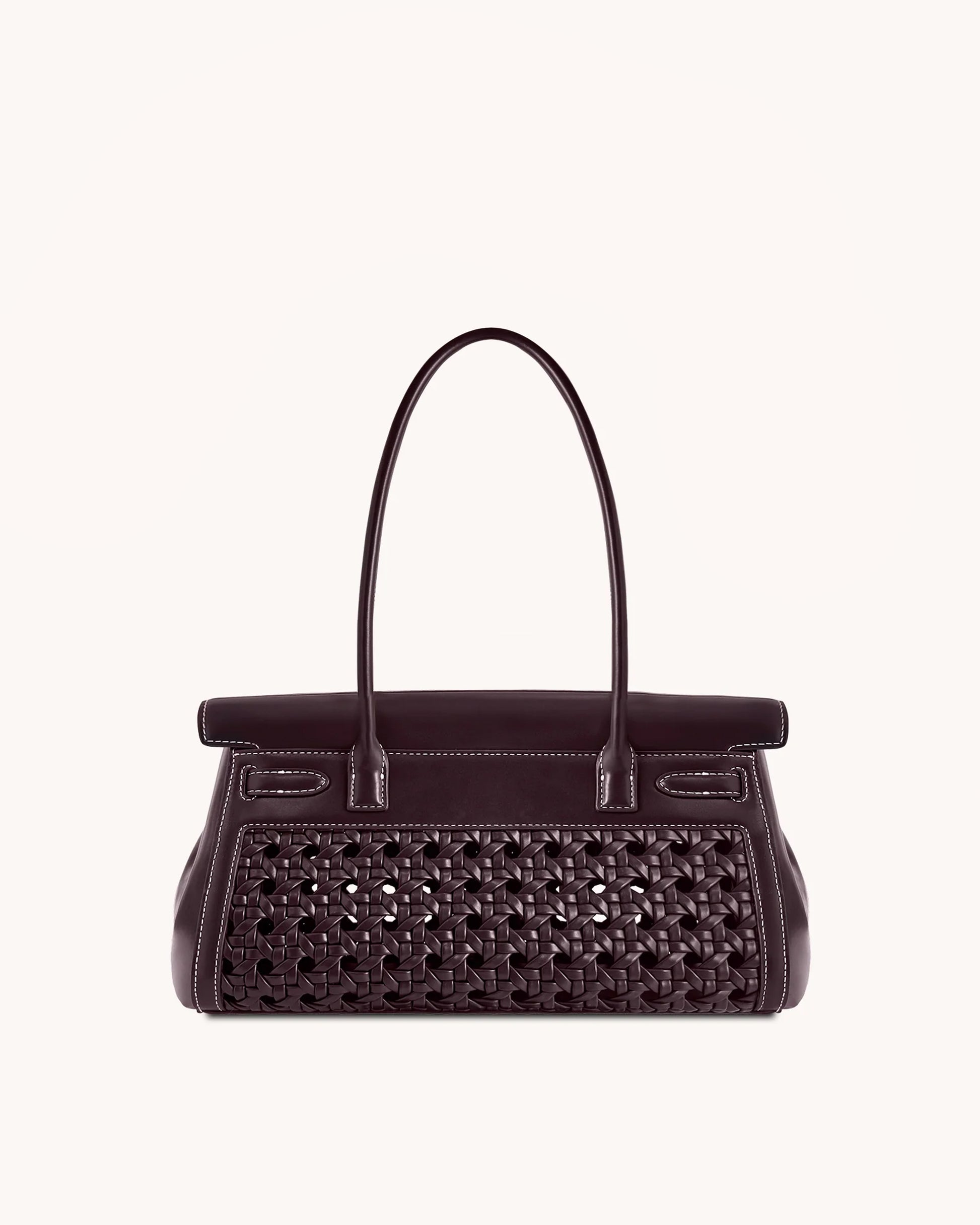 優雅手提包,正面採編織設計,配以金色五金。容量充足、結構挺括且時尚,適合日常或辦公使用。質地細緻光滑,外觀成熟且多變,展現現代風格。