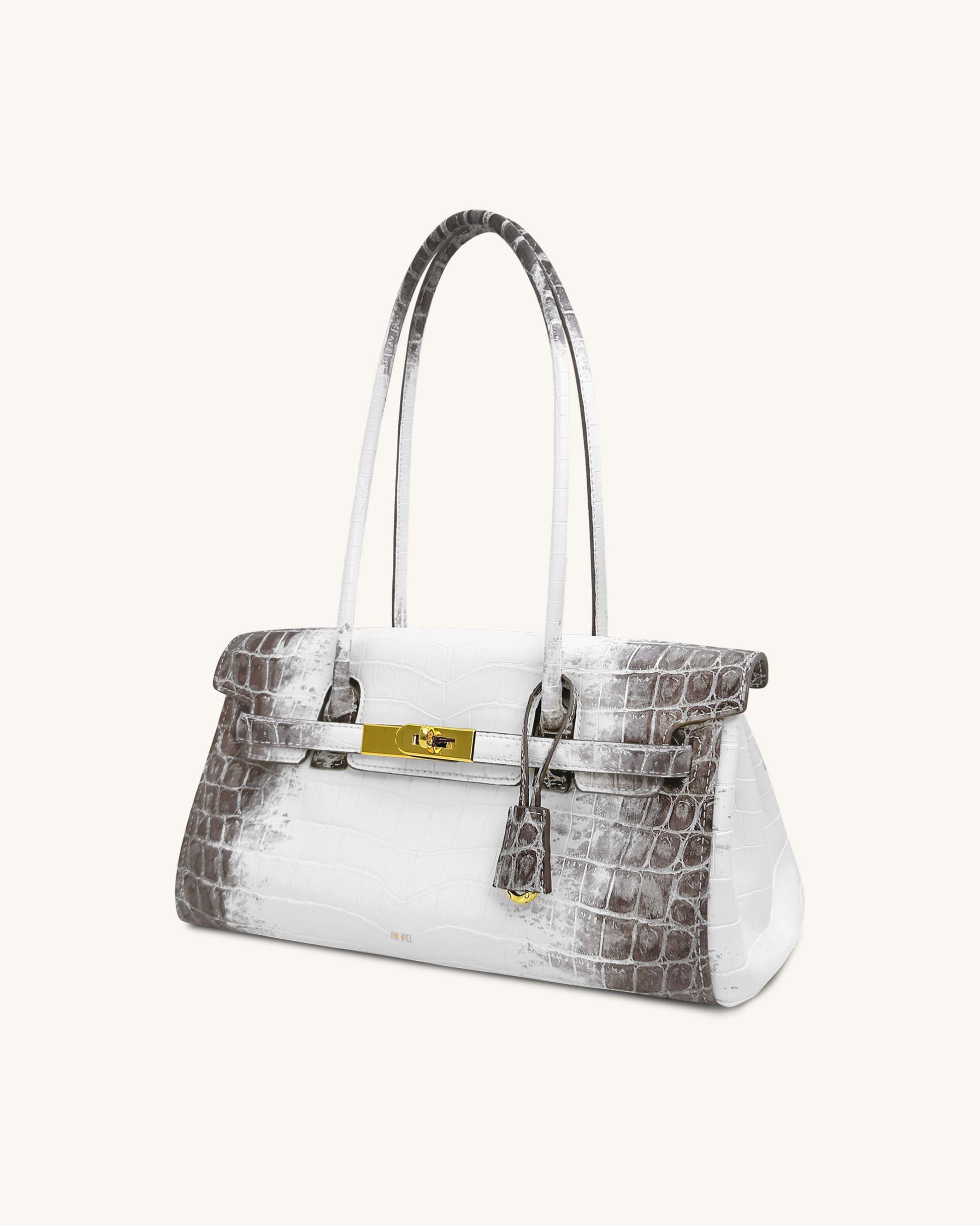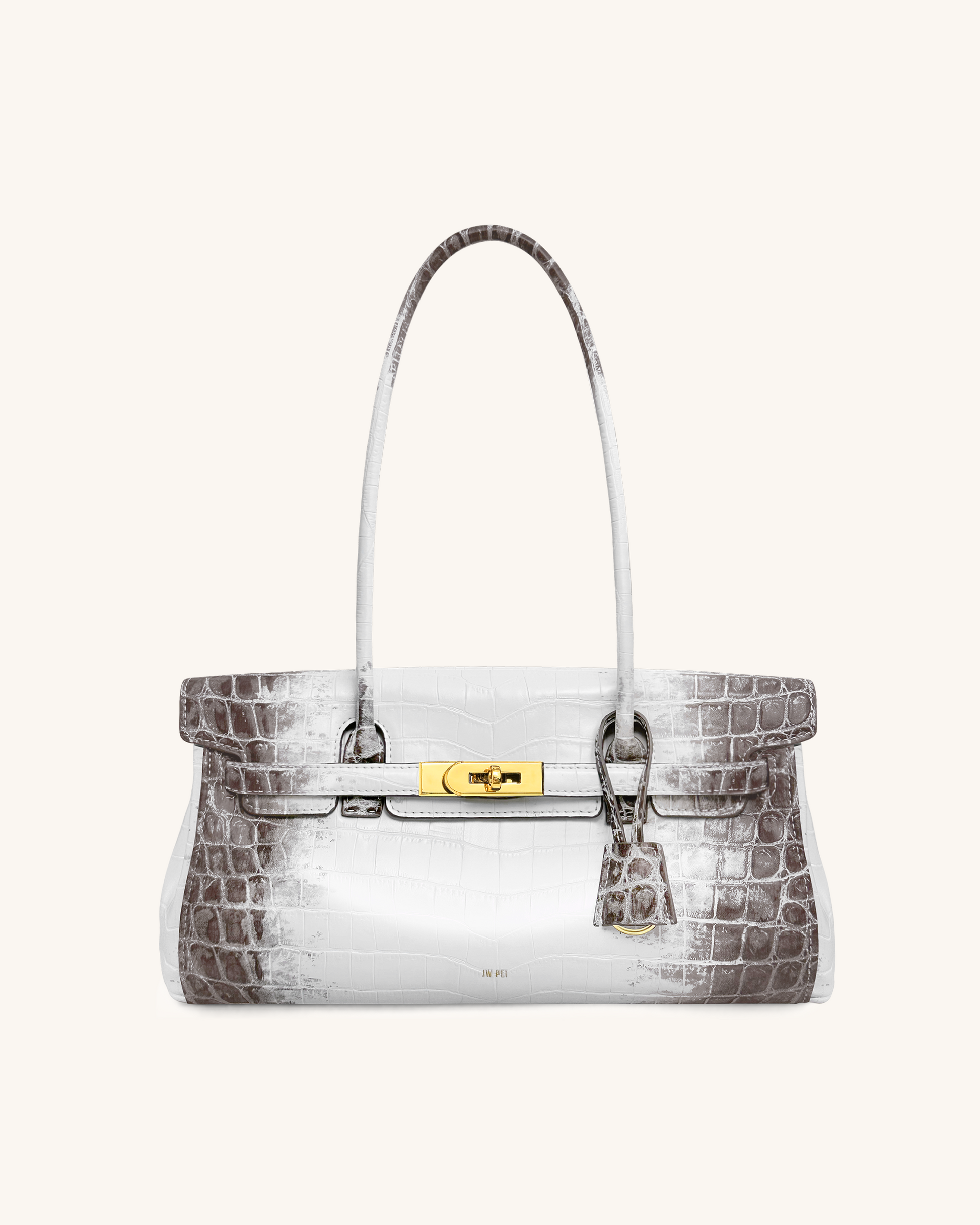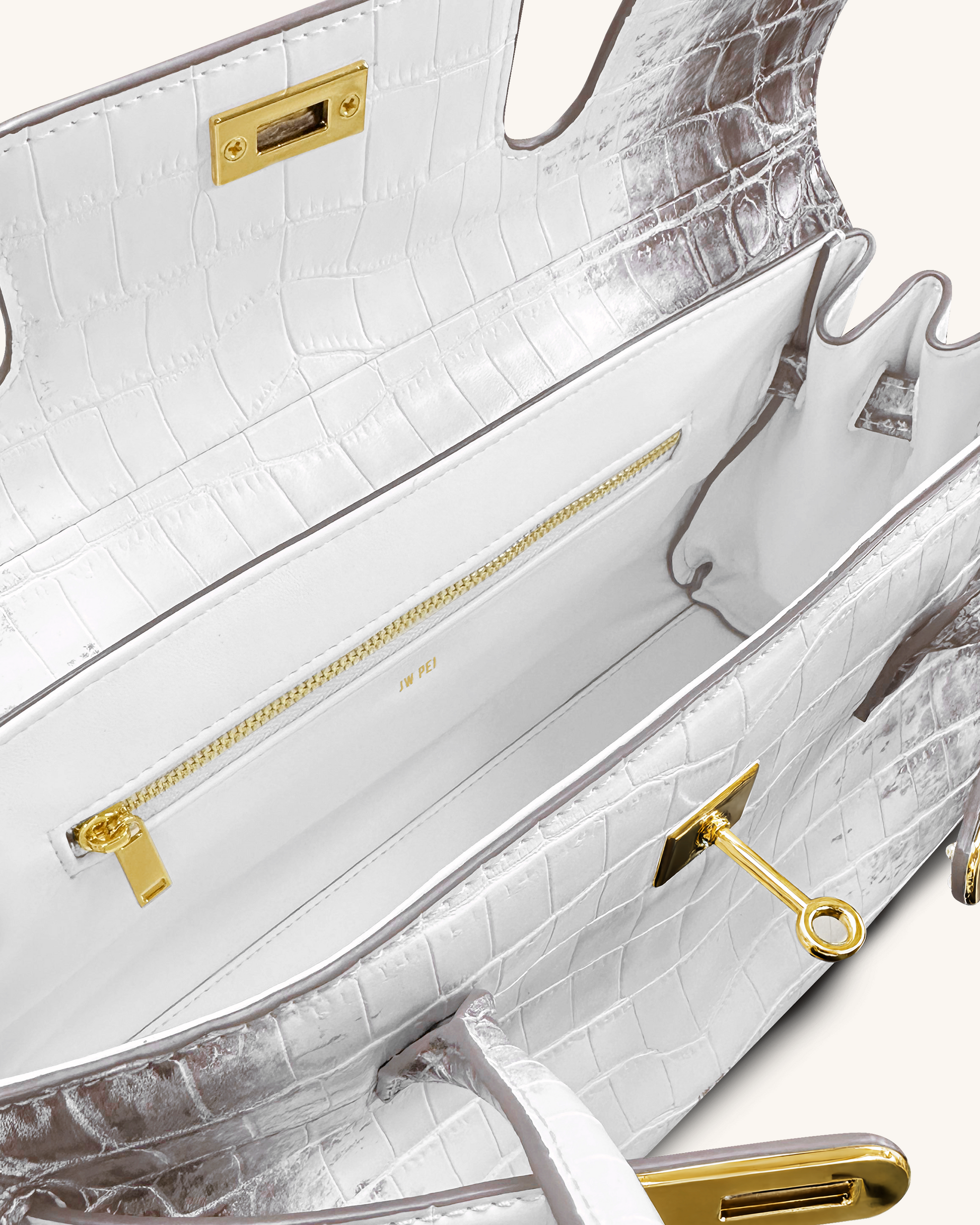 優雅手提包,採用奢華鱷魚壓紋純素皮革製成,金色五金點綴展現精緻品味。容量寬敞,足夠收納日常所需物品。